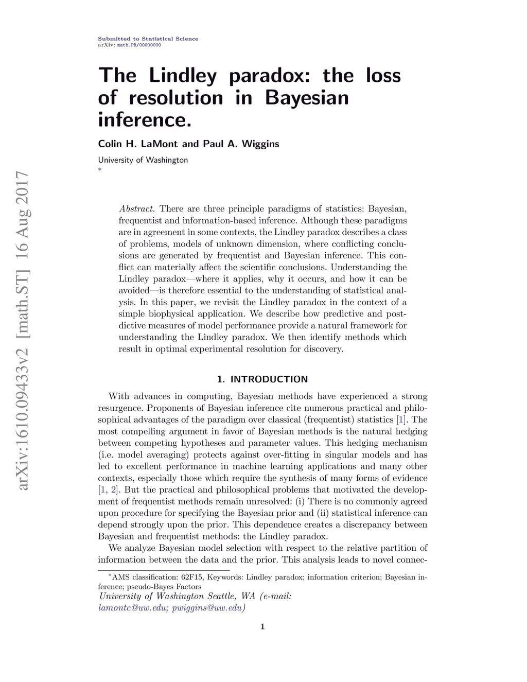There are three principle paradigms of statistics: Bayesian, frequentist and information-based inference. Although these paradigms are in agreement in some contexts, the Lindley paradox describes a class of problems, models of unknown dimension, where conflicting conclusions are generated by frequentist and Bayesian inference. This conflict can materially affect the scientific conclusions. Understanding the Lindley paradox---where it applies, why it occurs, and how it can be avoided---is therefore essential to the understanding of statistical analysis. In this paper, we revisit the Lindley paradox in the context of a simple biophysical application. We describe how predictive and postdictive measures of model performance provide a natural framework for understanding the Lindley paradox. We then identify methods which result in optimal experimental resolution for discovery.