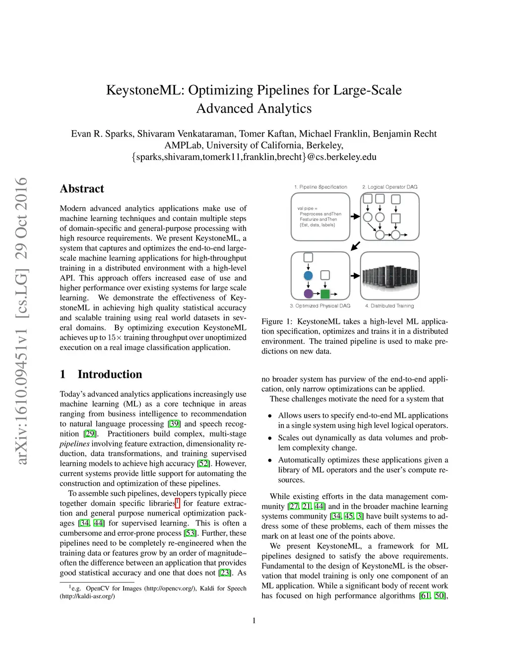 KeystoneML: Optimizing Pipelines for Large-Scale Advanced Analytics
