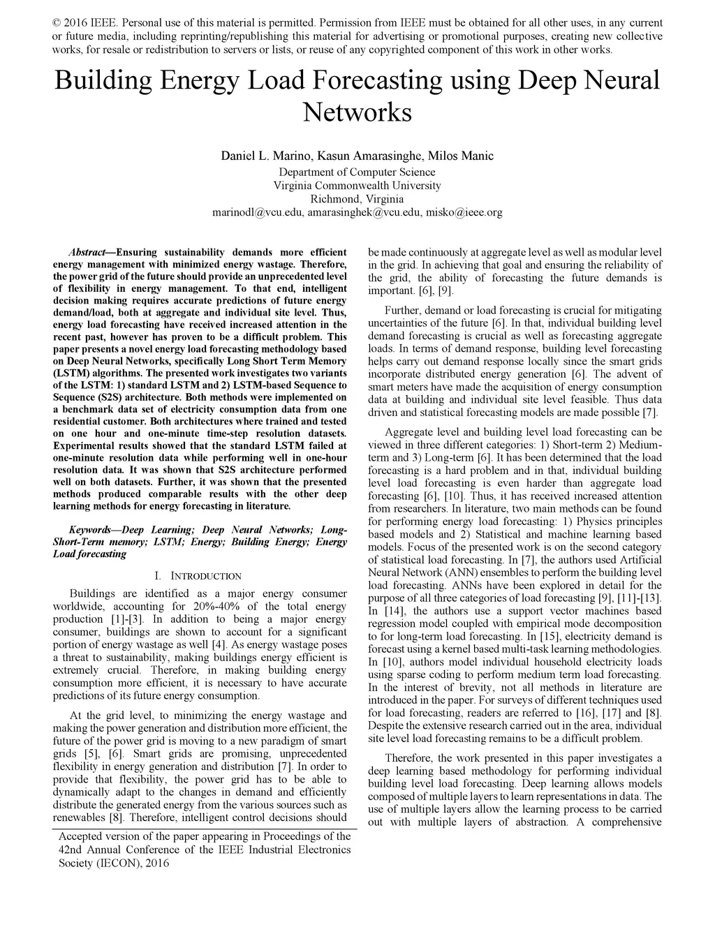 Ensuring sustainability demands more efficient energy management with minimized energy wastage. Therefore, the power grid of the future should provide an unprecedented level of flexibility in energy management. To that end, intelligent decision making requires accurate predictions of future energy demand/load, both at aggregate and individual site level. Thus, energy load forecasting have received increased attention in the recent past, however has proven to be a difficult problem. This paper presents a novel energy load forecasting methodology based on Deep Neural Networks, specifically Long Short Term Memory (LSTM) algorithms. The presented work investigates two variants of the LSTM: 1) standard LSTM and 2) LSTM-based Sequence to Sequence (S2S) architecture. Both methods were implemented on a benchmark data set of electricity consumption data from one residential customer. Both architectures where trained and tested on one hour and one-minute time-step resolution datasets. Experimental results showed that the standard LSTM failed at one-minute resolution data while performing well in one-hour resolution data. It was shown that S2S architecture performed well on both datasets. Further, it was shown that the presented methods produced comparable results with the other deep learning methods for energy forecasting in literature.