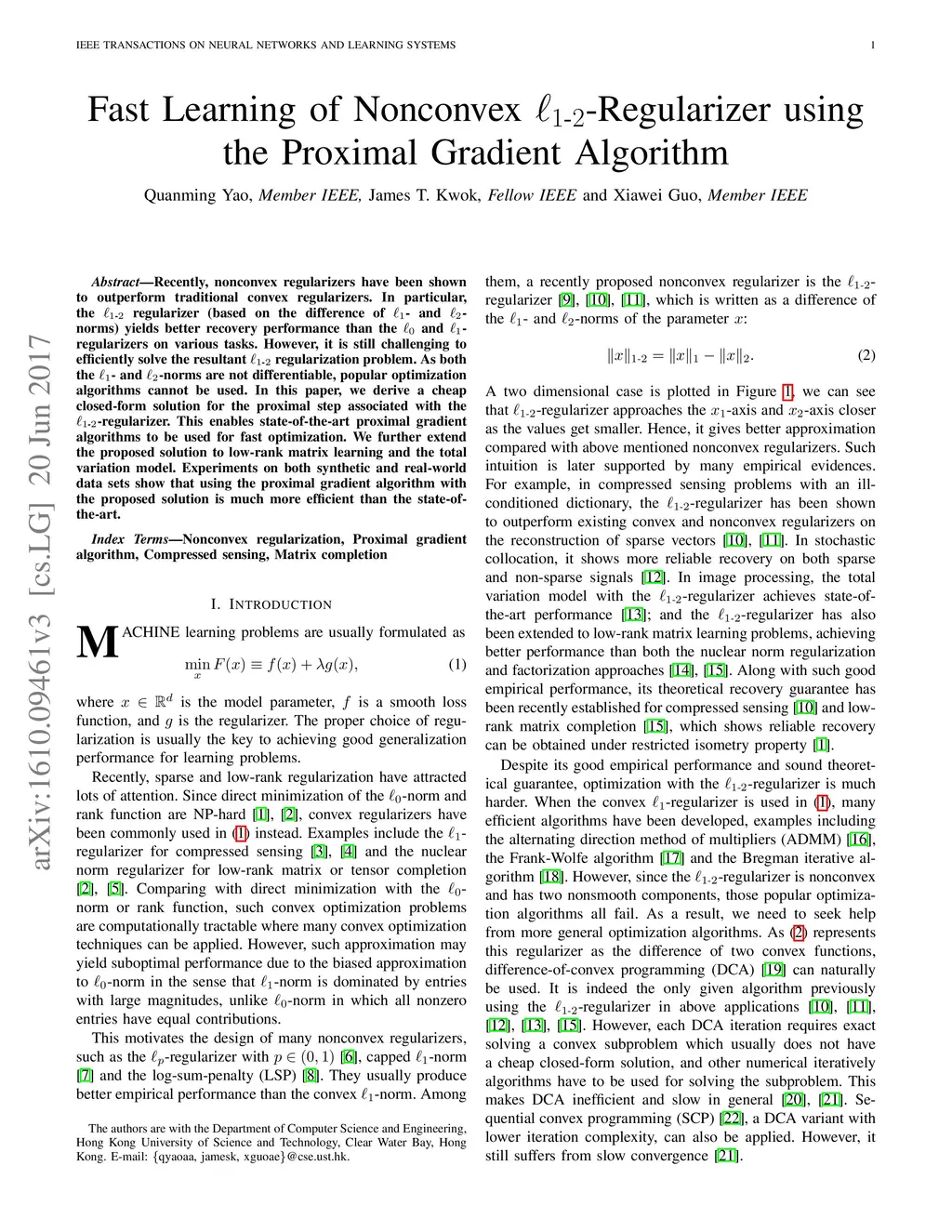 Convex regularizers are often used for sparse learning. They are easy to optimize, but can lead to inferior prediction performance. The difference of 1\ell_1 and 2\ell_2 (12\ell_{1-2}) regularizer has been recently proposed as a nonconvex regularizer. It yields better recovery than both 0\ell_0 and 1\ell_1 regularizers on compressed sensing. However, how to efficiently optimize its learning problem is still challenging. The main difficulty is that both the 1\ell_1 and 2\ell_2 norms in 12\ell_{1-2} are not differentiable, and existing optimization algorithms cannot be applied. In this paper, we show that a closed-form solution can be derived for the proximal step associated with this regularizer. We further extend the result for low-rank matrix learning and the total variation model. Experiments on both synthetic and real data sets show that the resultant accelerated proximal gradient algorithm is more efficient than other noncovex optimization algorithms.