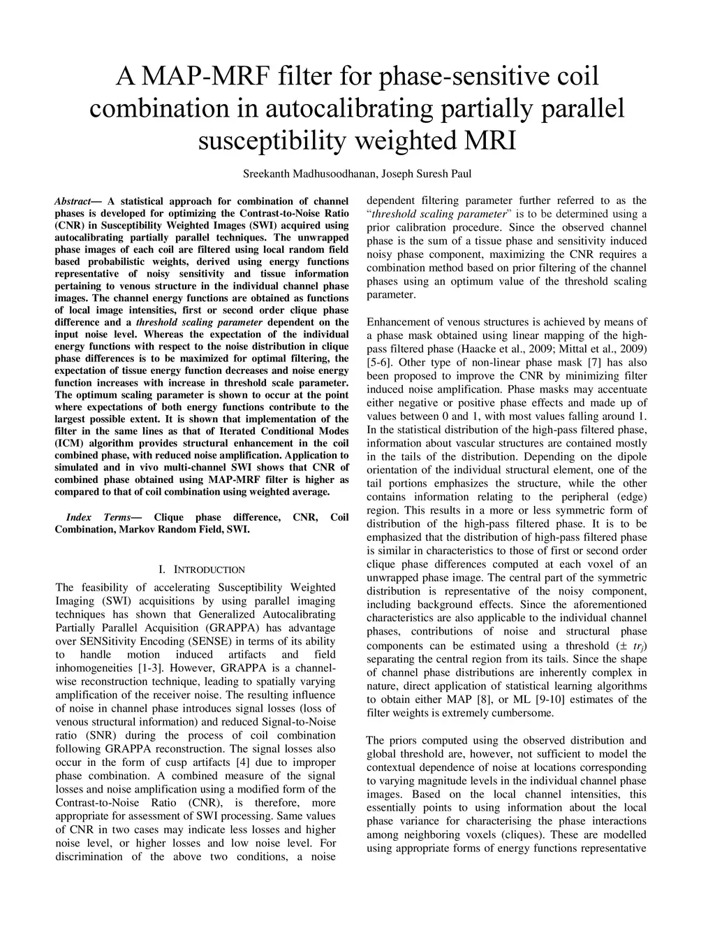 A statistical approach for combination of channel phases is developed for optimizing the Contrast-to-Noise Ratio (CNR) in Susceptibility Weighted Images (SWI) acquired using autocalibrating partially parallel techniques. The unwrapped phase images of each coil are filtered using local random field based probabilistic weights, derived using energy functions representative of noisy sensitivity and tissue information pertaining to venous structure in the individual channel phase images. The channel energy functions are obtained as functions of local image intensities, first or second order clique phase difference and a threshold scaling parameter dependent on the input noise level. Whereas the expectation of the individual energy functions with respect to the noise distribution in clique phase differences is to be maximized for optimal filtering, the expectation of tissue energy function decreases and noise energy function increases with increase in threshold scale parameter. The optimum scaling parameter is shown to occur at the point where expectations of both energy functions contribute to the largest possible extent. It is shown that implementation of the filter in the same lines as that of Iterated Conditional Modes (ICM) algorithm provides structural enhancement in the coil combined phase, with reduced noise amplification. Application to simulated and in vivo multi-channel SWI shows that CNR of combined phase obtained using MAP-MRF filter is higher as compared to that of coil combination using weighted average.