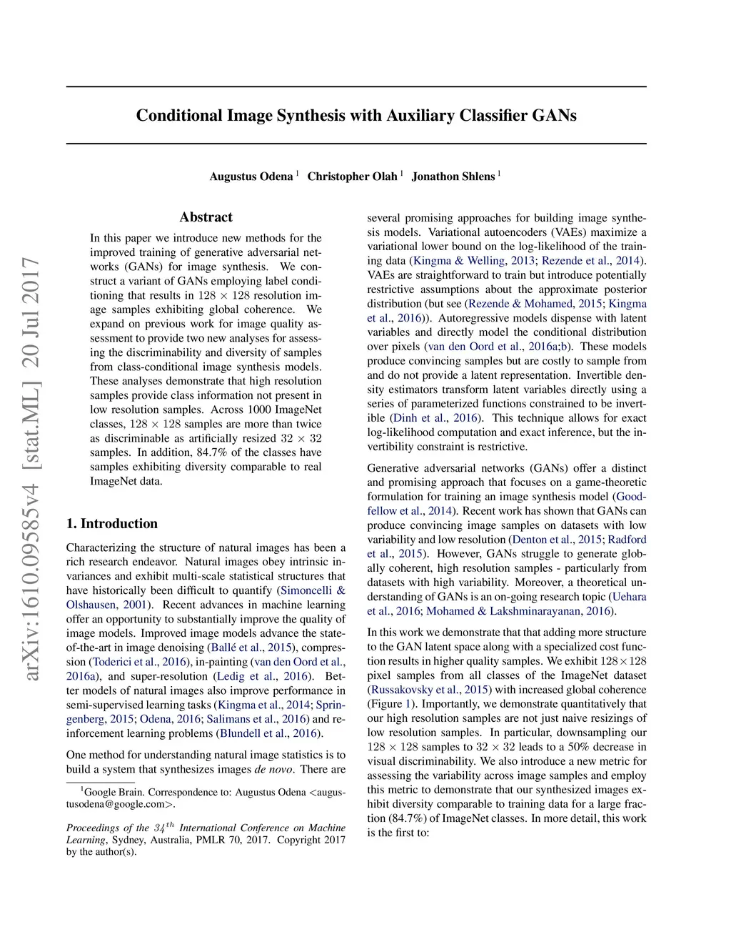 Synthesizing high resolution photorealistic images has been a long-standing challenge in machine learning. In this paper we introduce new methods for the improved training of generative adversarial networks (GANs) for image synthesis. We construct a variant of GANs employing label conditioning that results in 128x128 resolution image samples exhibiting global coherence. We expand on previous work for image quality assessment to provide two new analyses for assessing the discriminability and diversity of samples from class-conditional image synthesis models. These analyses demonstrate that high resolution samples provide class information not present in low resolution samples. Across 1000 ImageNet classes, 128x128 samples are more than twice as discriminable as artificially resized 32x32 samples. In addition, 84.7% of the classes have samples exhibiting diversity comparable to real ImageNet data.