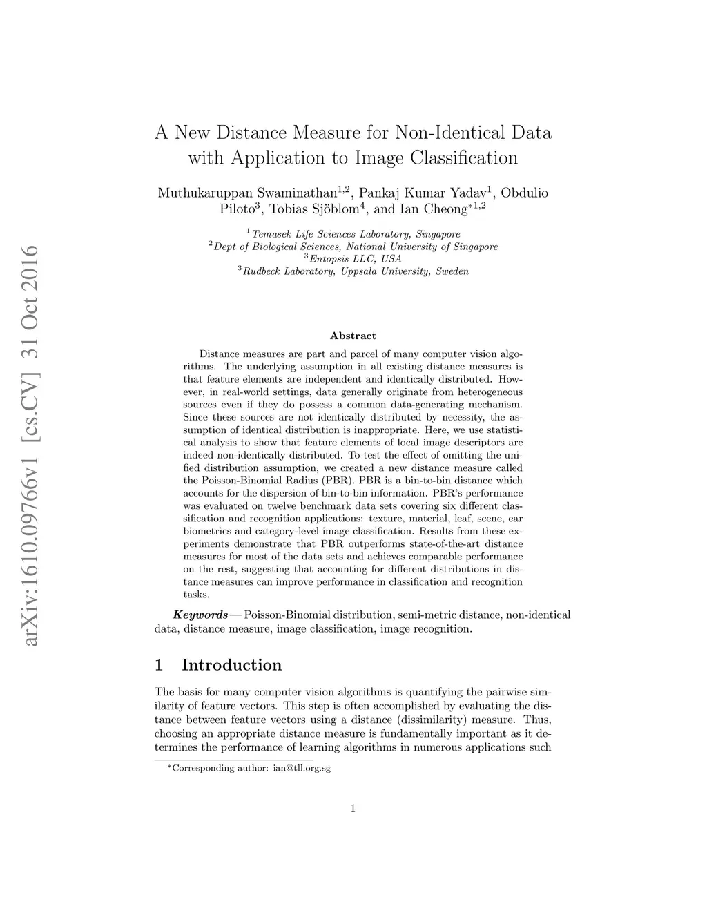 Distance measures are part and parcel of many computer vision algorithms. The underlying assumption in all existing distance measures is that feature elements are independent and identically distributed. However, in real-world settings, data generally originate from heterogeneous sources even if they do possess a common data-generating mechanism. Since these sources are not identically distributed by necessity, the assumption of identical distribution is inappropriate. Here, we use statistical analysis to show that feature elements of local image descriptors are indeed non-identically distributed. To test the effect of omitting the unified distribution assumption, we created a new distance measure called the Poisson-Binomial Radius (PBR). PBR is a bin-to-bin distance which accounts for the dispersion of bin-to-bin information. PBR's performance was evaluated on twelve benchmark data sets covering six different classification and recognition applications: texture, material, leaf, scene, ear biometrics and category-level image classification. Results from these experiments demonstrate that PBR outperforms state-of-the-art distance measures for most of the data sets and achieves comparable performance on the rest, suggesting that accounting for different distributions in distance measures can improve performance in classification and recognition tasks.