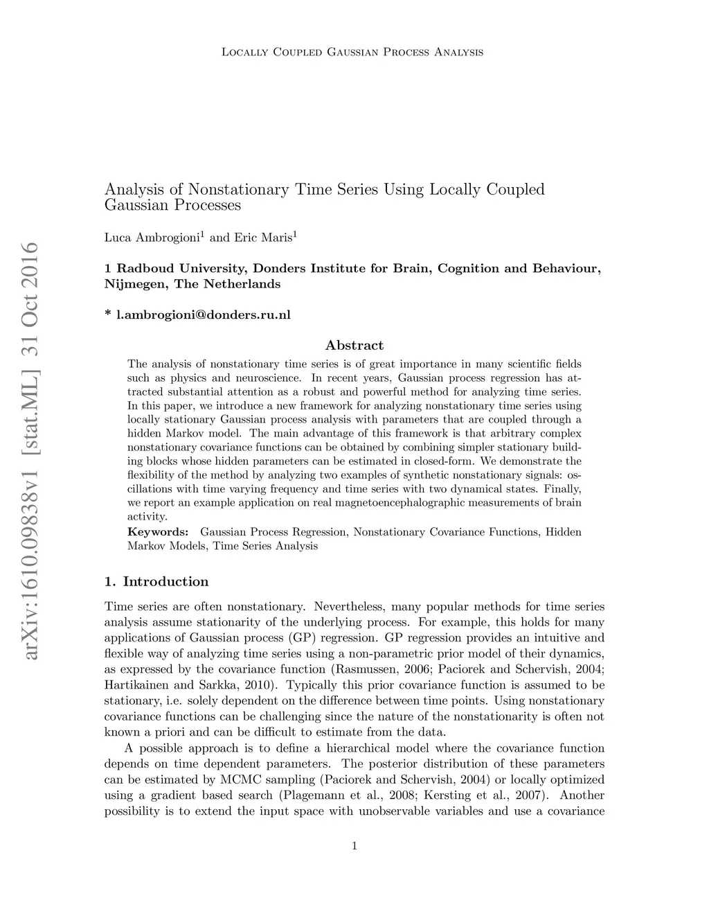 The analysis of nonstationary time series is of great importance in many scientific fields such as physics and neuroscience. In recent years, Gaussian process regression has attracted substantial attention as a robust and powerful method for analyzing time series. In this paper, we introduce a new framework for analyzing nonstationary time series using locally stationary Gaussian process analysis with parameters that are coupled through a hidden Markov model. The main advantage of this framework is that arbitrary complex nonstationary covariance functions can be obtained by combining simpler stationary building blocks whose hidden parameters can be estimated in closed-form. We demonstrate the flexibility of the method by analyzing two examples of synthetic nonstationary signals: oscillations with time varying frequency and time series with two dynamical states. Finally, we report an example application on real magnetoencephalographic measurements of brain activity.