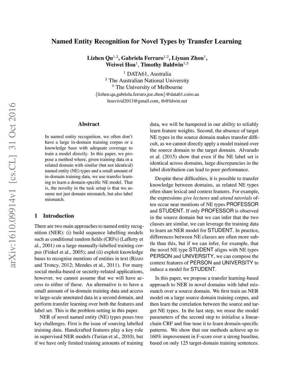 Named Entity Recognition for Novel Types by Transfer Learning