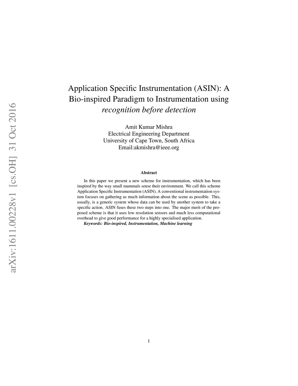 In this paper we present a new scheme for instrumentation, which has been inspired by the way small mammals sense their environment. We call this scheme Application Specific Instrumentation (ASIN). A conventional instrumentation system focuses on gathering as much information about the scene as possible. This, usually, is a generic system whose data can be used by another system to take a specific action. ASIN fuses these two steps into one. The major merit of the proposed scheme is that it uses low resolution sensors and much less computational overhead to give good performance for a highly specialised application