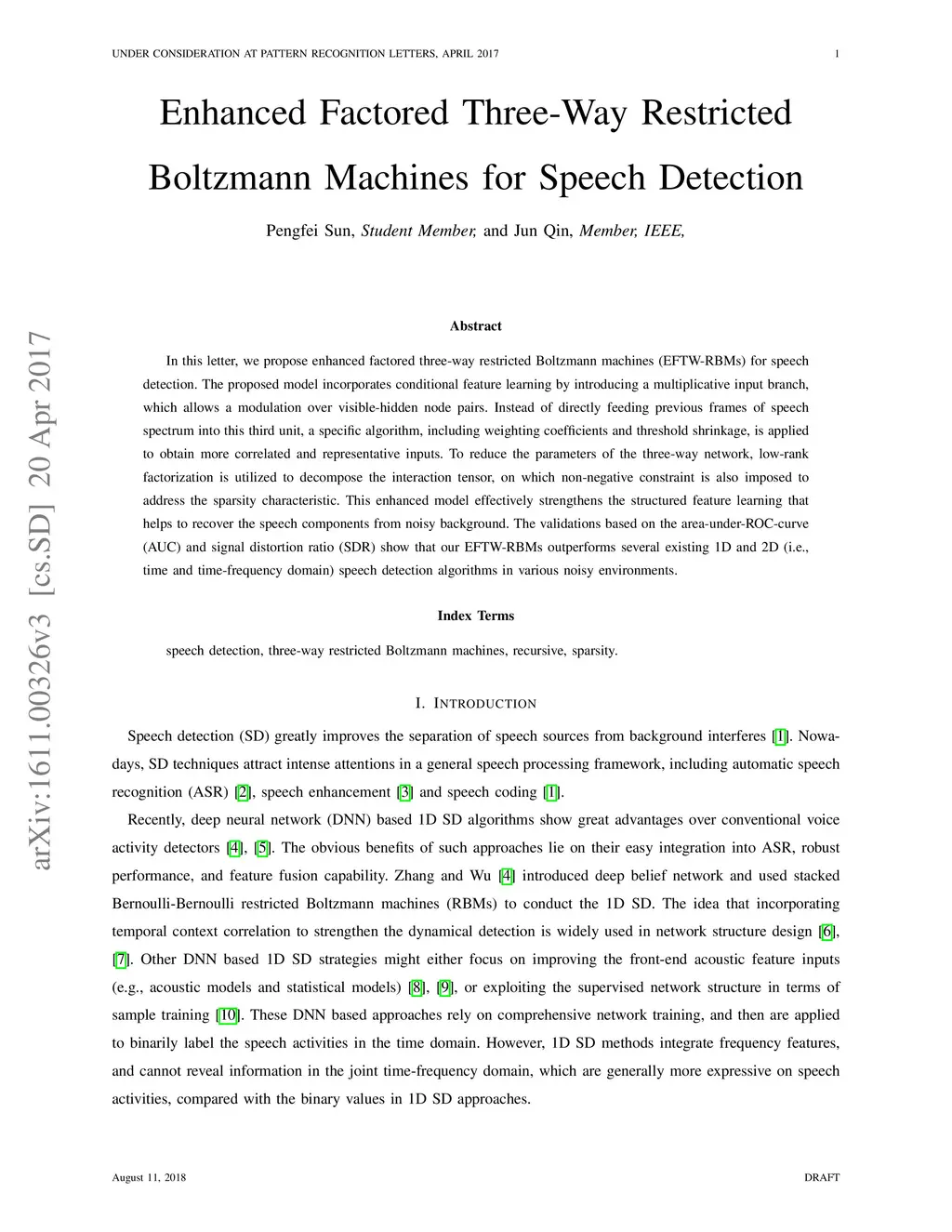 In this letter, we propose enhanced factored three way restricted Boltzmann machines (EFTW-RBMs) for speech detection. The proposed model incorporates conditional feature learning by multiplying the dynamical state of the third unit, which allows a modulation over the visible-hidden node pairs. Instead of stacking previous frames of speech as the third unit in a recursive manner, the correlation related weighting coefficients are assigned to the contextual neighboring frames. Specifically, a threshold function is designed to capture the long-term features and blend the globally stored speech structure. A factored low rank approximation is introduced to reduce the parameters of the three-dimensional interaction tensor, on which non-negative constraint is imposed to address the sparsity characteristic. The validations through the area-under-ROC-curve (AUC) and signal distortion ratio (SDR) show that our approach outperforms several existing 1D and 2D (i.e., time and time-frequency domain) speech detection algorithms in various noisy environments.