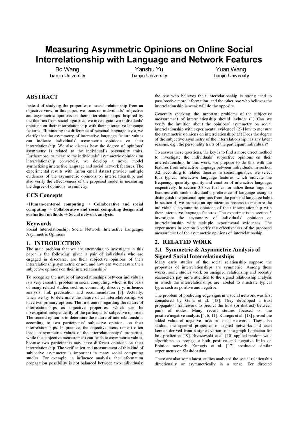 Instead of studying the properties of social relationship from an objective view, in this paper, we focus on individuals' subjective and asymmetric opinions on their interrelationships. Inspired by the theories from sociolinguistics, we investigate two individuals' opinions on their interrelationship with their interactive language features. Eliminating the difference of personal language style, we clarify that the asymmetry of interactive language feature values can indicate individuals' asymmetric opinions on their interrelationship. We also discuss how the degree of opinions' asymmetry is related to the individuals' personality traits. Furthermore, to measure the individuals' asymmetric opinions on interrelationship concretely, we develop a novel model synthetizing interactive language and social network features. The experimental results with Enron email dataset provide multiple evidences of the asymmetric opinions on interrelationship, and also verify the effectiveness of the proposed model in measuring the degree of opinions' asymmetry.