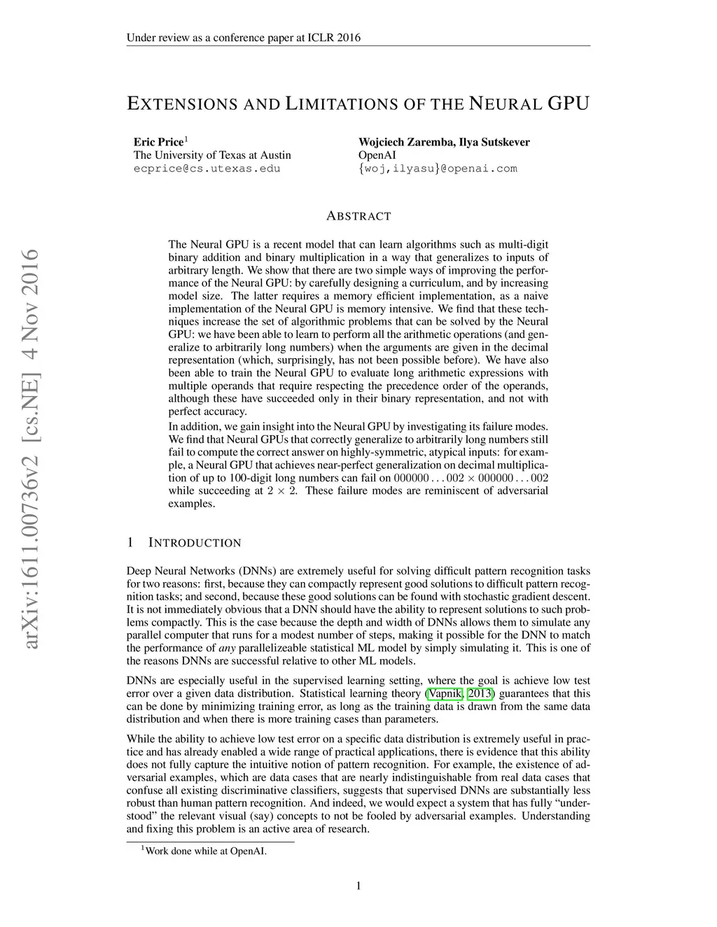The Neural GPU is a recent model that can learn algorithms such as multi-digit binary addition and binary multiplication in a way that generalizes to inputs of arbitrary length. We show that there are two simple ways of improving the performance of the Neural GPU: by carefully designing a curriculum, and by increasing model size. The latter requires a memory efficient implementation, as a naive implementation of the Neural GPU is memory intensive. We find that these techniques increase the set of algorithmic problems that can be solved by the Neural GPU: we have been able to learn to perform all the arithmetic operations (and generalize to arbitrarily long numbers) when the arguments are given in the decimal representation (which, surprisingly, has not been possible before). We have also been able to train the Neural GPU to evaluate long arithmetic expressions with multiple operands that require respecting the precedence order of the operands, although these have succeeded only in their binary representation, and not with perfect accuracy. In addition, we gain insight into the Neural GPU by investigating its failure modes. We find that Neural GPUs that correctly generalize to arbitrarily long numbers still fail to compute the correct answer on highly-symmetric, atypical inputs: for example, a Neural GPU that achieves near-perfect generalization on decimal multiplication of up to 100-digit long numbers can fail on while succeeding at . These failure modes are reminiscent of adversarial examples.