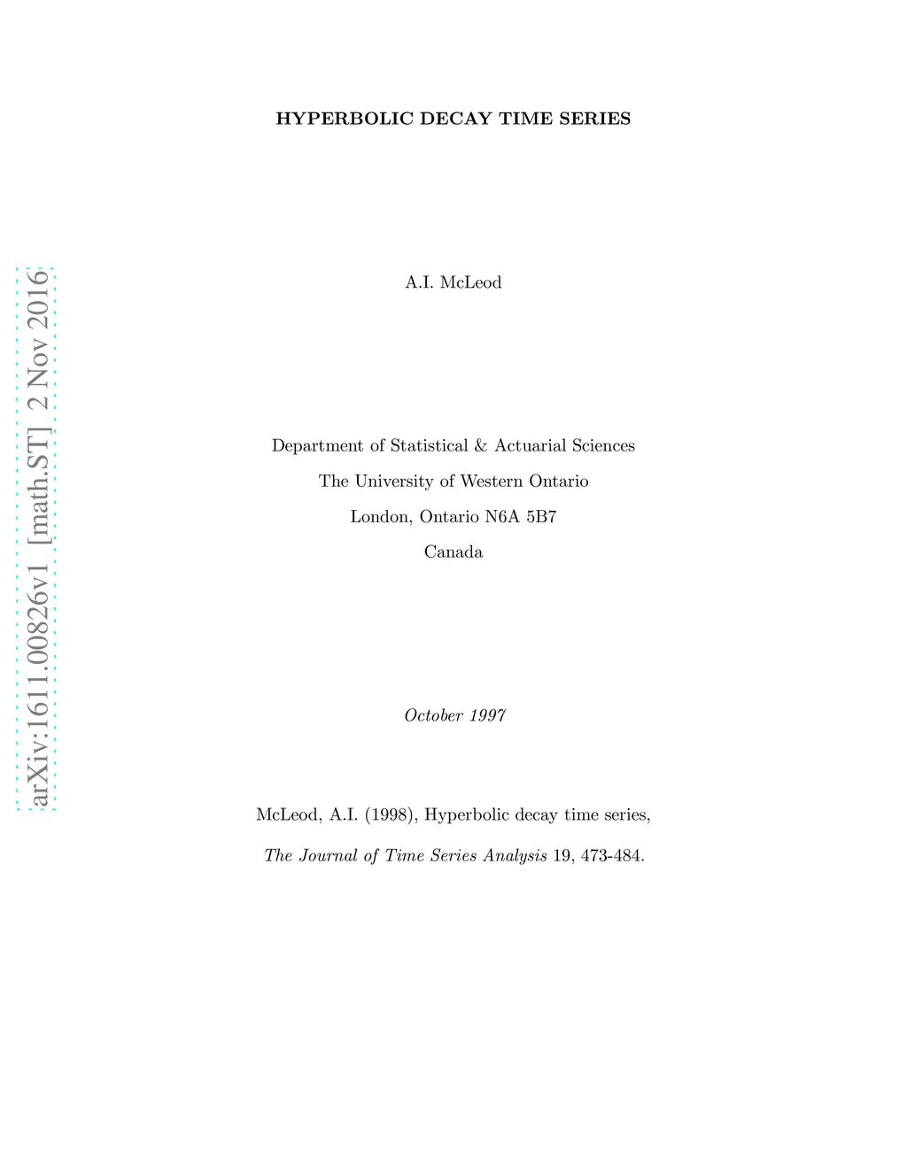 Hyperbolic decay time series such as, fractional Gaussian noise (FGN) or fractional autoregressive moving-average (FARMA) process, each exhibit two distinct types of behaviour: strong persistence or antipersistence. Beran (1994) characterized the family of strongly persistent time series. A more general family of hyperbolic decay time series is introduced and its basic properties are characterized in terms of the autocovariance and spectral density functions. The random shock and inverted form representations are derived. It is shown that every strongly persistent series is the dual of an antipersistent series and vice versa. The asymptotic generalized variance of hyperbolic decay time series with unit innovation variance is shown to be infinite which implies that the variance of the minimum mean-square error one-step linear predictor using the last observations decays slowly to the innovation variance as gets large.
