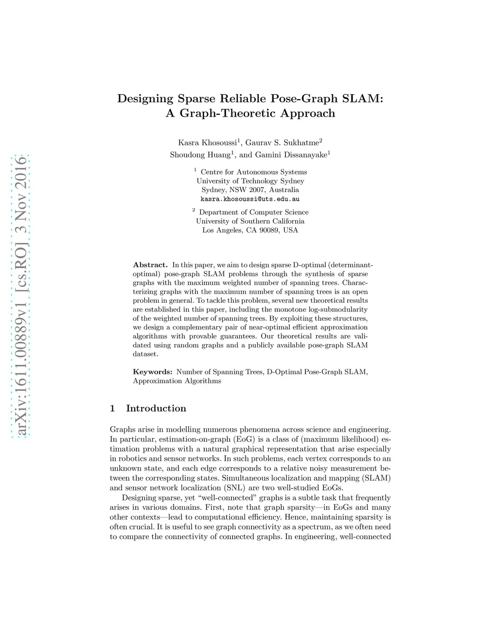 In this paper, we aim to design sparse D-optimal (determinantoptimal) pose-graph SLAM problems through the synthesis of sparse graphs with the maximum weighted number of spanning trees. Characterizing graphs with the maximum number of spanning trees is an open problem in general. To tackle this problem, several new theoretical results are established in this paper, including the monotone log-submodularity of the weighted number of spanning trees. By exploiting these structures, we design a complementary pair of near-optimal efficient approximation algorithms with provable guarantees. Our theoretical results are validated using random graphs and a publicly available pose-graph SLAM dataset.