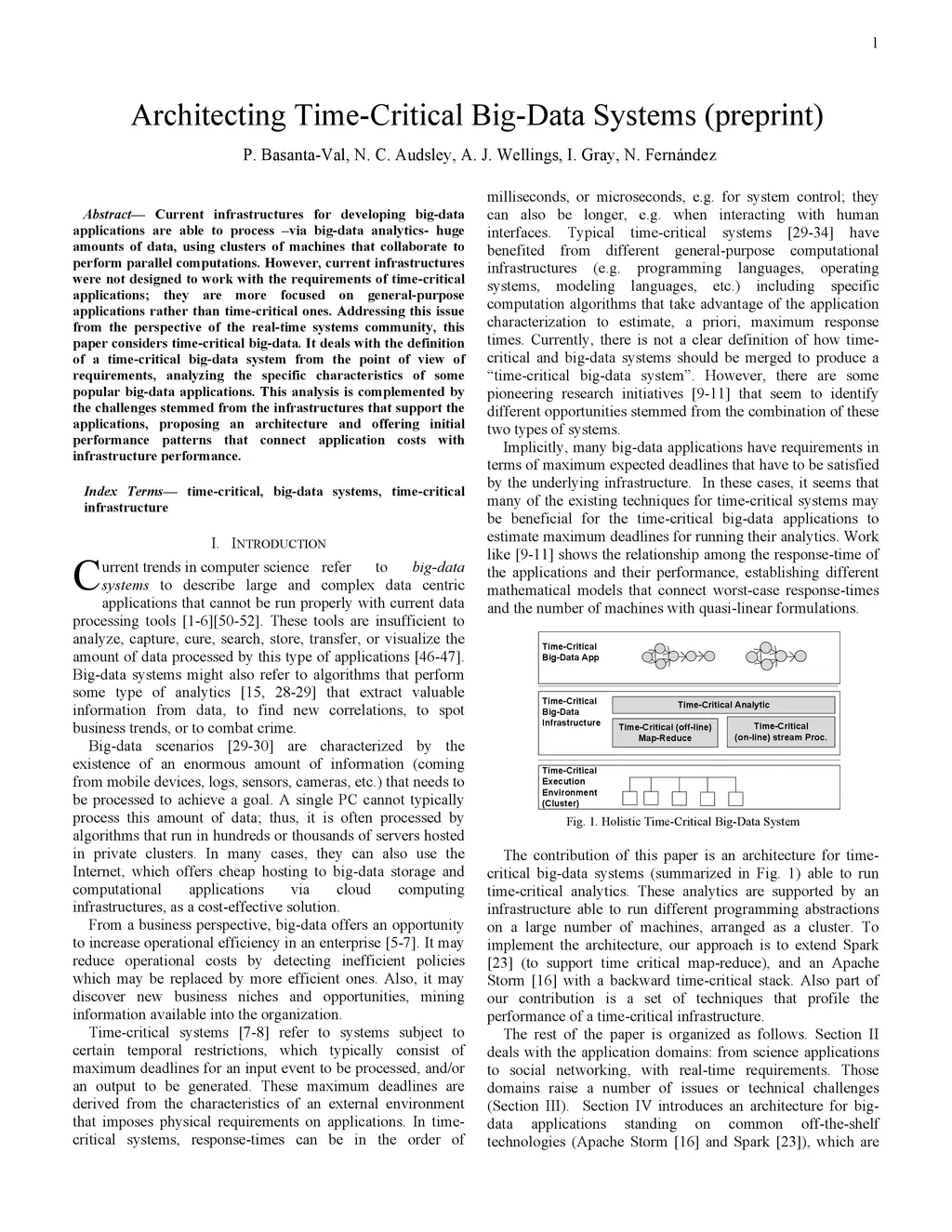 - Current infrastructures for developing big-data applications are able to process --via big-data analytics-huge amounts of data, using clusters of machines that collaborate to perform parallel computations. However, current infrastructures were not designed to work with the requirements of time-critical applications; they are more focused on general-purpose applications rather than time-critical ones. Addressing this issue from the perspective of the real-time systems community, this paper considers time-critical big-data. It deals with the definition of a time-critical big-data system from the point of view of requirements, analyzing the specific characteristics of some popular big-data applications. This analysis is complemented by the challenges stemmed from the infrastructures that support the applications, proposing an architecture and offering initial performance patterns that connect application costs with infrastructure performance.