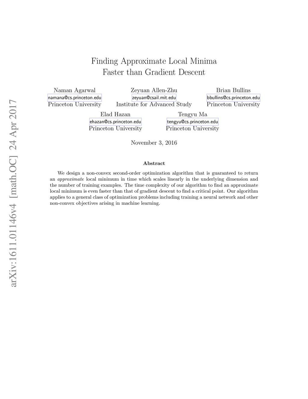 We design a non-convex second-order optimization algorithm that is guaranteed to return an approximate local minimum in time which scales linearly in the underlying dimension and the number of training examples. The time complexity of our algorithm to find an approximate local minimum is even faster than that of gradient descent to find a critical point. Our algorithm applies to a general class of optimization problems including training a neural network and other non-convex objectives arising in machine learning.