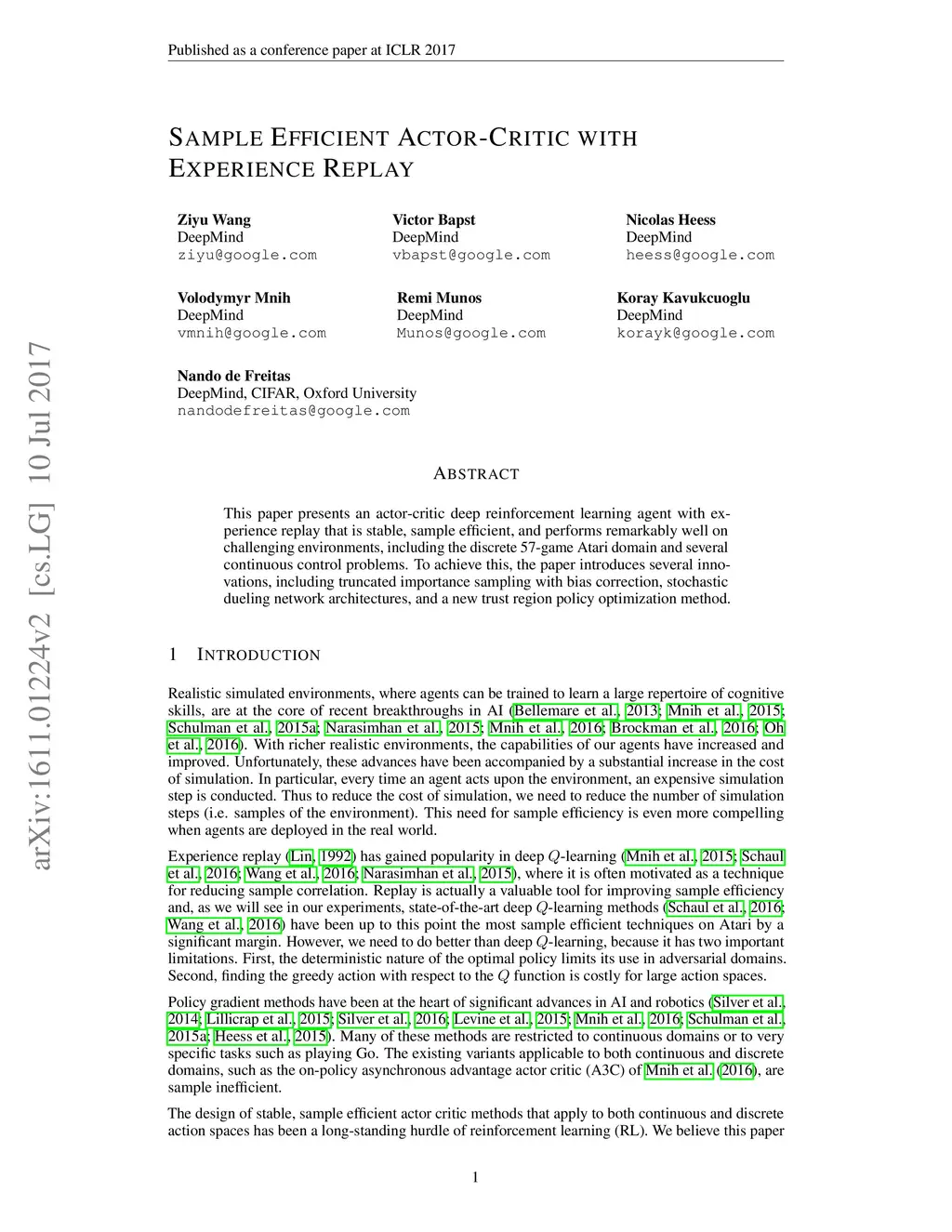 This paper presents an actor-critic deep reinforcement learning agent with experience replay that is stable, sample efficient, and performs remarkably well on challenging environments, including the discrete 57-game Atari domain and several continuous control problems. To achieve this, the paper introduces several innovations, including truncated importance sampling with bias correction, stochastic dueling network architectures, and a new trust region policy optimization method.