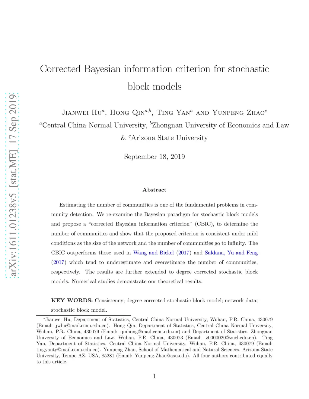 Estimating the number of communities is one of the fundamental problems in community detection. We re-examine the Bayesian paradigm for stochastic block models and propose a "corrected Bayesian information criterion",to determine the number of communities and show that the proposed estimator is consistent under mild conditions. The proposed criterion improves those used in Wang and Bickel (2016) and Saldana et al. (2017) which tend to underestimate and overestimate the number of communities, respectively. Along the way, we establish the Wilks theorem for stochastic block models. Moreover, we show that, to obtain the consistency of model selection for stochastic block models, we need a so-called "consistency condition". We also provide sufficient conditions for both homogenous networks and non-homogenous networks. The results are further extended to degree corrected stochastic block models. Numerical studies demonstrate our theoretical results.