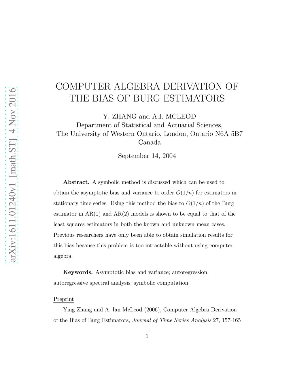 A symbolic method is discussed which can be used to obtain the asymptotic bias and variance to order for estimators in stationary time series. Using this method the bias to of the Burg estimator in AR(1) and AR(2) models is shown to be equal to that of the least squares estimators in both the known and unknown mean cases. Previous researchers have only been able to obtain simulation results for this bias because this problem is too intractable without using computer algebra.
