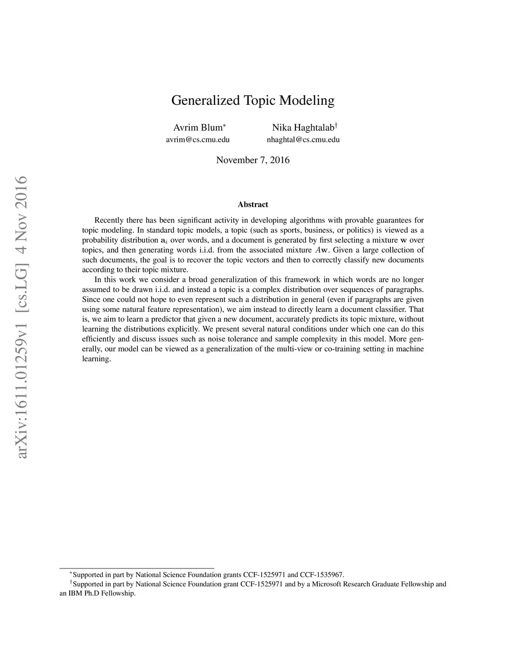 Recently there has been significant activity in developing algorithms with provable guarantees for topic modeling. In standard topic models, a topic (such as sports, business, or politics) is viewed as a probability distribution over words, and a document is generated by first selecting a mixture over topics, and then generating words i.i.d. from the associated mixture . Given a large collection of such documents, the goal is to recover the topic vectors and then to correctly classify new documents according to their topic mixture. In this work we consider a broad generalization of this framework in which words are no longer assumed to be drawn i.i.d. and instead a topic is a complex distribution over sequences of paragraphs. Since one could not hope to even represent such a distribution in general (even if paragraphs are given using some natural feature representation), we aim instead to directly learn a document classifier. That is, we aim to learn a predictor that given a new document, accurately predicts its topic mixture, without learning the distributions explicitly. We present several natural conditions under which one can do this efficiently and discuss issues such as noise tolerance and sample complexity in this model. More generally, our model can be viewed as a generalization of the multi-view or co-training setting in machine learning.
