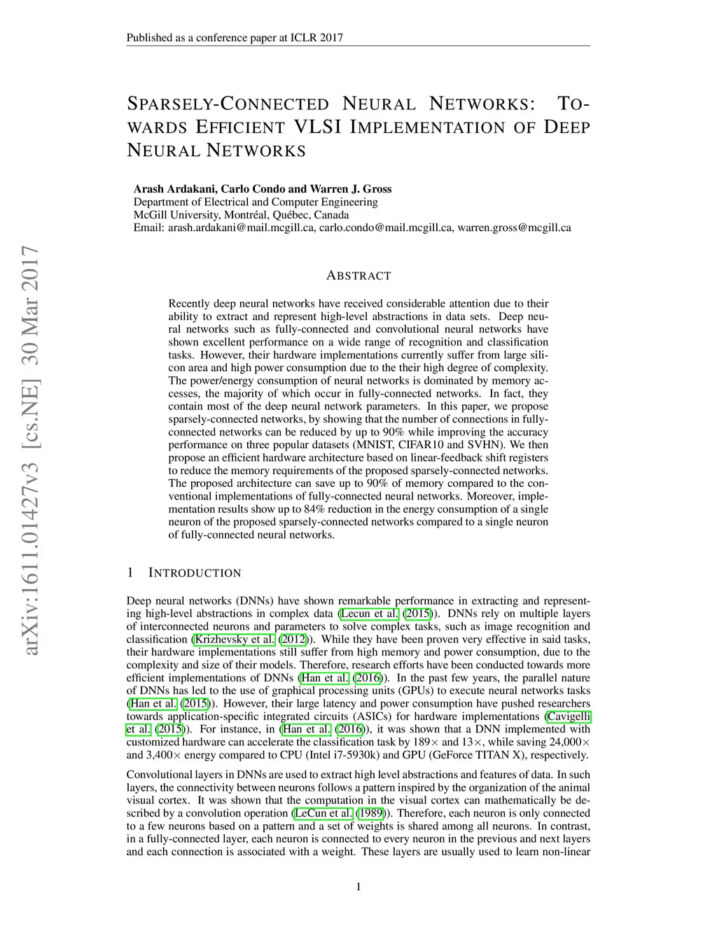 Sparsely-Connected Neural Networks: Towards Efficient VLSI