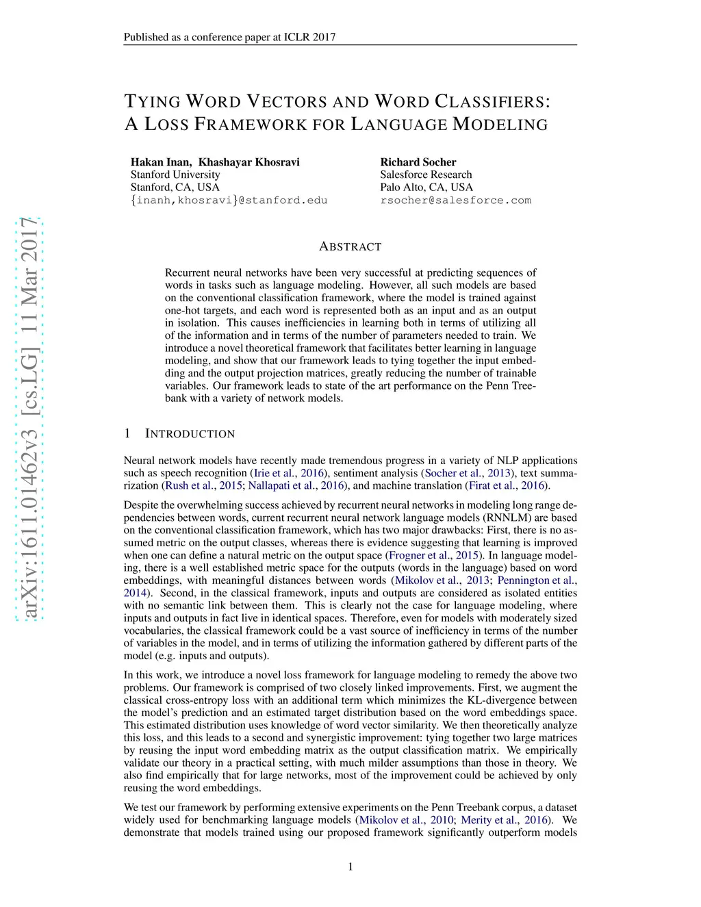 Recurrent neural networks have been very successful at predicting sequences of words in tasks such as language modeling. However, all such models are based on the conventional classification framework, where model is trained against one-hot targets, and each word is represented both as an input and as an output in isolation. This causes inefficiencies in learning both in terms of utilizing all of the information and in terms of the number of parameters needed to train. We introduce a novel theoretical framework that facilitates better learning in language modeling, and show that our framework leads to tying together the input embedding and the output projection matrices, greatly reducing the number of trainable variables. Our LSTM model lowers the state of the art word-level perplexity on the Penn Treebank to 68.5.