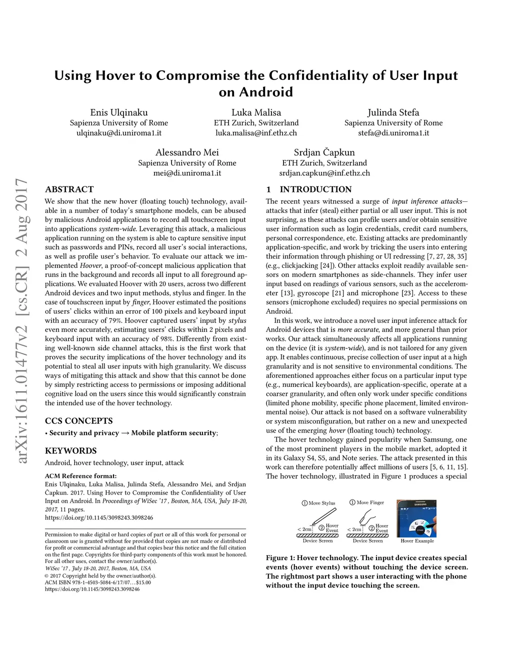Using Hover to Compromise the Confidentiality of User Input on Android