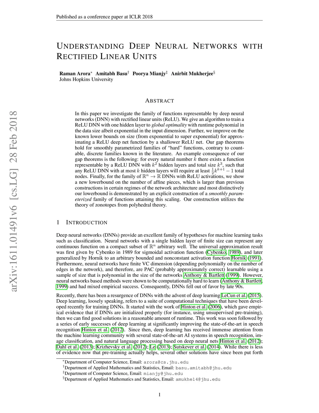 In this paper we investigate the family of functions representable by deep neural networks (DNN) with rectified linear units (ReLU). We give an algorithm to train a ReLU DNN with one hidden layer to *global optimality* with runtime polynomial in the data size albeit exponential in the input dimension. Further, we improve on the known lower bounds on size (from exponential to super exponential) for approximating a ReLU deep net function by a shallower ReLU net. Our gap theorems hold for smoothly parametrized families of "hard" functions, contrary to countable, discrete families known in the literature. An example consequence of our gap theorems is the following: for every natural number there exists a function representable by a ReLU DNN with hidden layers and total size , such that any ReLU DNN with at most hidden layers will require at least total nodes. Finally, for the family of DNNs with ReLU activations, we show a new lowerbound on the number of affine pieces, which is larger than previous constructions in certain regimes of the network architecture and most distinctively our lowerbound is demonstrated by an explicit construction of a *smoothly parameterized* family of functions attaining this scaling. Our construction utilizes the theory of zonotopes from polyhedral theory.