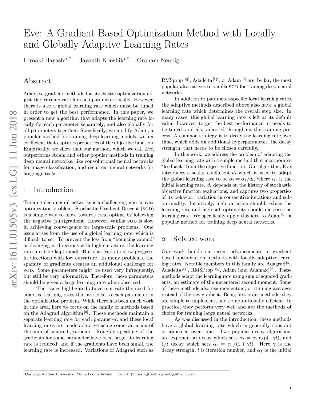 Adaptive gradient methods for stochastic optimization adjust the learning rate for each parameter locally. However, there is also a global learning rate which must be tuned in order to get the best performance. In this paper, we present a new algorithm that adapts the learning rate locally for each parameter separately, and also globally for all parameters together. Specifically, we modify Adam, a popular method for training deep learning models, with a coefficient that captures properties of the objective function. Empirically, we show that our method, which we call Eve, outperforms Adam and other popular methods in training deep neural networks, like convolutional neural networks for image classification, and recurrent neural networks for language tasks.