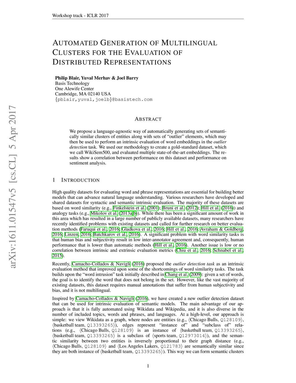 We propose a language-agnostic way of automatically generating sets of semantically similar clusters of entities along with sets of "outlier" elements, which may then be used to perform an intrinsic evaluation of word embeddings in the outlier detection task. We used our methodology to create a gold-standard dataset, which we call WikiSem500, and evaluated multiple state-of-the-art embeddings. The results show a correlation between performance on this dataset and performance on sentiment analysis.
