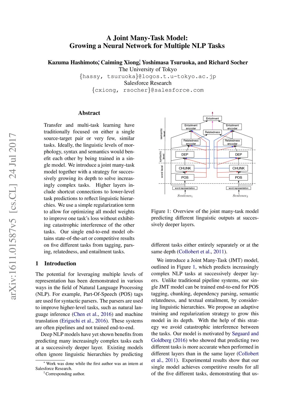 Transfer and multi-task learning have traditionally focused on either a single source-target pair or very few, similar tasks. Ideally, the linguistic levels of morphology, syntax and semantics would benefit each other by being trained in a single model. We introduce a joint many-task model together with a strategy for successively growing its depth to solve increasingly complex tasks. Higher layers include shortcut connections to lower-level task predictions to reflect linguistic hierarchies. We use a simple regularization term to allow for optimizing all model weights to improve one task's loss without exhibiting catastrophic interference of the other tasks. Our single end-to-end model obtains state-of-the-art or competitive results on five different tasks from tagging, parsing, relatedness, and entailment tasks.