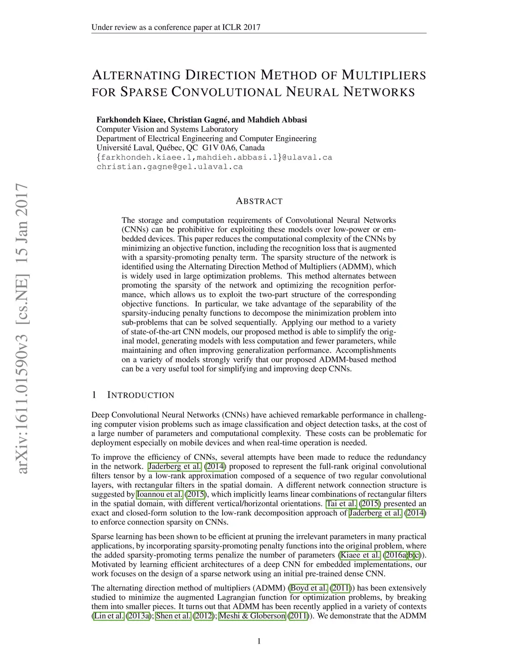 The storage and computation requirements of Convolutional Neural Networks (CNNs) can be prohibitive for exploiting these models over low-power or embedded devices. This paper reduces the computational complexity of the CNNs by minimizing an objective function, including the recognition loss that is augmented with a sparsity-promoting penalty term. The sparsity structure of the network is identified using the Alternating Direction Method of Multipliers (ADMM), which is widely used in large optimization problems. This method alternates between promoting the sparsity of the network and optimizing the recognition performance, which allows us to exploit the two-part structure of the corresponding objective functions. In particular, we take advantage of the separability of the sparsity-inducing penalty functions to decompose the minimization problem into sub-problems that can be solved sequentially. Applying our method to a variety of state-of-the-art CNN models, our proposed method is able to simplify the original model, generating models with less computation and fewer parameters, while maintaining and often improving generalization performance. Accomplishments on a variety of models strongly verify that our proposed ADMM-based method can be a very useful tool for simplifying and improving deep CNNs.