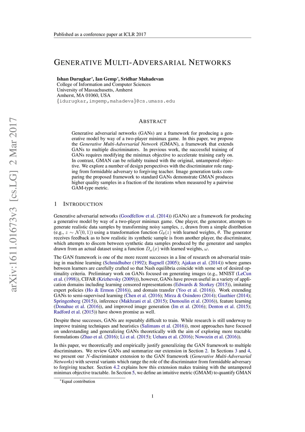 Generative adversarial networks (GANs) are a framework for producing a generative model by way of a two-player minimax game. In this paper, we propose the \emph{Generative Multi-Adversarial Network} (GMAN), a framework that extends GANs to multiple discriminators. In previous work, the successful training of GANs requires modifying the minimax objective to accelerate training early on. In contrast, GMAN can be reliably trained with the original, untampered objective. We explore a number of design perspectives with the discriminator role ranging from formidable adversary to forgiving teacher. Image generation tasks comparing the proposed framework to standard GANs demonstrate GMAN produces higher quality samples in a fraction of the iterations when measured by a pairwise GAM-type metric.