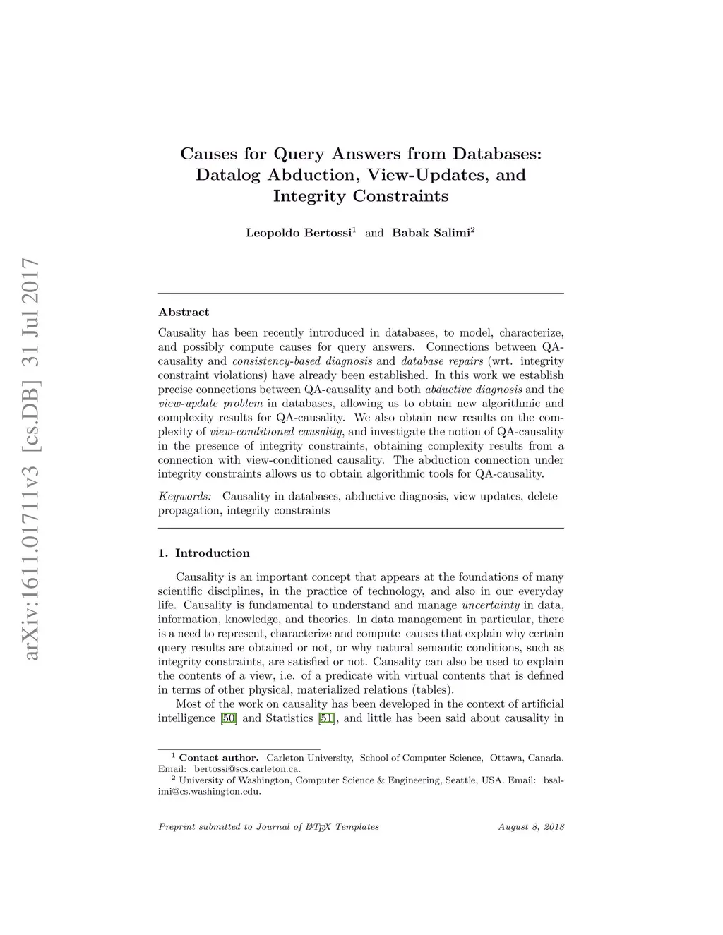 Causality has been recently introduced in databases, to model, characterize, and possibly compute causes for query answers. Connections between QA-causality and consistency-based diagnosis and database repairs (wrt. integrity constraint violations) have already been established. In this work we establish precise connections between QA-causality and both abductive diagnosis and the view-update problem in databases, allowing us to obtain new algorithmic and complexity results for QA-causality. We also obtain new results on the complexity of view-conditioned causality, and investigate the notion of QA-causality in the presence of integrity constraints, obtaining complexity results from a connection with view-conditioned causality. The abduction connection under integrity constraints allows us to obtain algorithmic tools for QA-causality.