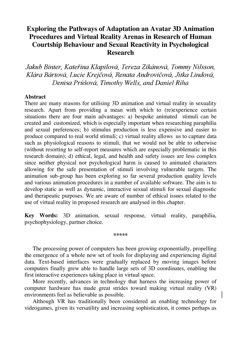 There are many reasons for utilising 3D animation and virtual reality in sexuality research. Apart from providing a mean with which to (re)experience certain situations there are four main advantages: a) bespoke animated stimuli can be created and customized, which is especially important when researching paraphilia and sexual preferences, b) stimulus production is less expensive and easier to produce compared to real world stimuli, c) virtual reality allows us to capture data such as physiological reasons to stimuli, that we would not be able to otherwise (without resorting to self-report measures which are especially problematic in this research domain), d) ethical, legal, and health and safety issues are less complex since neither physical nor psychological harm is caused to animated characters allowing for the safe presentation of stimuli involving vulnerable targets. The animation sub-group has been exploring so far several production quality levels and various animation procedures in a number of available software. The aim is to develop static as well as dynamic, interactive sexual stimuli for sexual diagnostic and therapeutic purposes. We are aware of number of ethical issues related to the use of virtual reality in proposed research are analysed in this chapter.