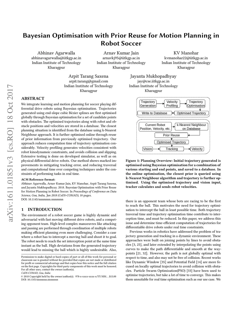 We integrate learning and motion planning for soccer playing differential drive robots using Bayesian optimisation. Trajectories generated using end-slope cubic Bezier splines are first optimised globally through Bayesian optimisation for a set of candidate points with obstacles. The optimised trajectories along with robot and obstacle positions and velocities are stored in a database. The closest planning situation is identified from the database using k-Nearest Neighbour approach. It is further optimised online through reuse of prior information from previously optimised trajectory. Our approach reduces computation time of trajectory optimisation considerably. Velocity profiling generates velocities consistent with robot kinodynamoic constraints, and avoids collision and slipping. Extensive testing is done on developed simulator, as well as on physical differential drive robots. Our method shows marked improvements in mitigating tracking error, and reducing traversal and computational time over competing techniques under the constraints of performing tasks in real time.