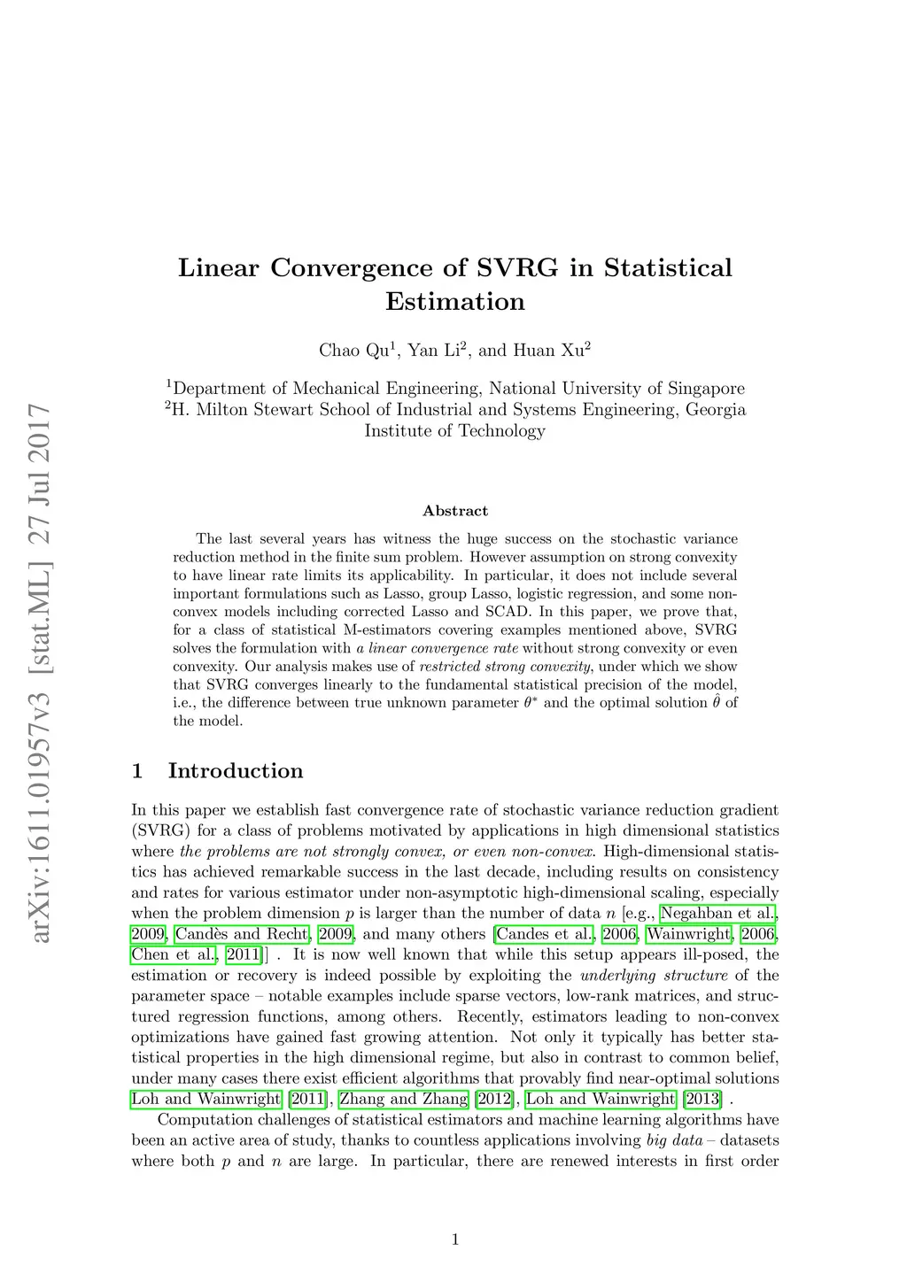 SVRG and its variants are among the state of art optimization algorithms for large scale machine learning problems. It is well known that SVRG converges linearly when the objective function is strongly convex. However this setup can be restrictive, and does not include several important formulations such as Lasso, group Lasso, logistic regression, and some non-convex models including corrected Lasso and SCAD. In this paper, we prove that, for a class of statistical M-estimators covering examples mentioned above, SVRG solves the formulation with {\em a linear convergence rate} without strong convexity or even convexity. Our analysis makes use of {\em restricted strong convexity}, under which we show that SVRG converges linearly to the fundamental statistical precision of the model, i.e., the difference between true unknown parameter and the optimal solution of the model.