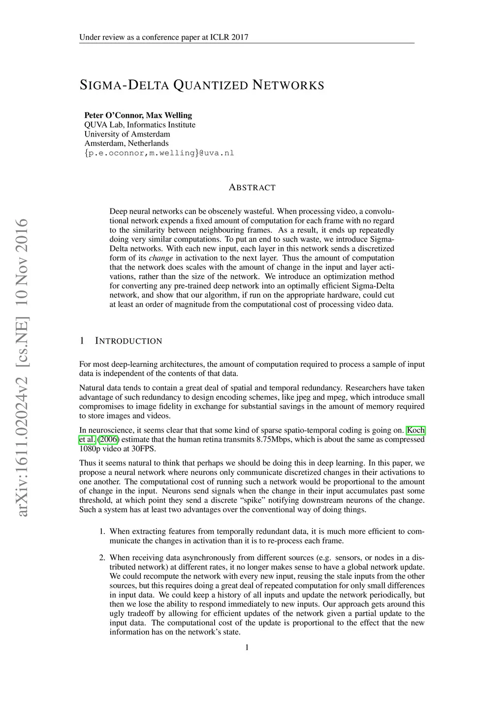 Deep neural networks can be obscenely wasteful. When processing video, a convolutional network expends a fixed amount of computation for each frame with no regard to the similarity between neighbouring frames. As a result, it ends up repeatedly doing very similar computations. To put an end to such waste, we introduce Sigma-Delta networks. With each new input, each layer in this network sends a discretized form of its change in activation to the next layer. Thus the amount of computation that the network does scales with the amount of change in the input and layer activations, rather than the size of the network. We introduce an optimization method for converting any pre-trained deep network into an optimally efficient Sigma-Delta network, and show that our algorithm, if run on the appropriate hardware, could cut at least an order of magnitude from the computational cost of processing video data.