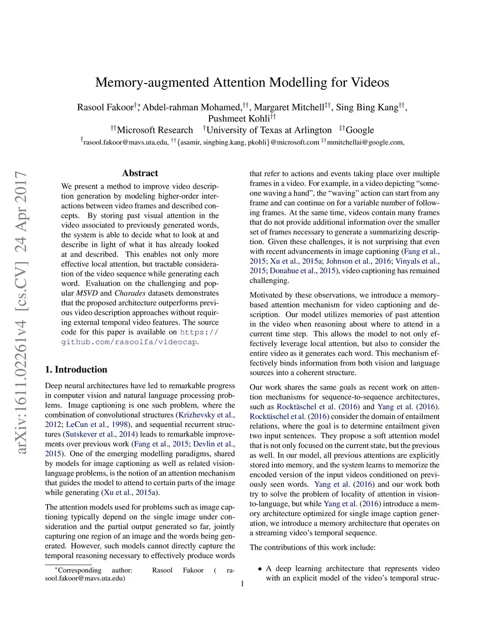 We present a method to improve video description generation by modeling higher-order interactions between video frames and described concepts. By storing past visual attention in the video associated to previously generated words, the system is able to decide what to look at and describe in light of what it has already looked at and described. This enables not only more effective local attention, but tractable consideration of the video sequence while generating each word. Evaluation on the challenging and popular MSVD and Charades datasets demonstrates that the proposed architecture outperforms previous video description approaches without requiring external temporal video features.