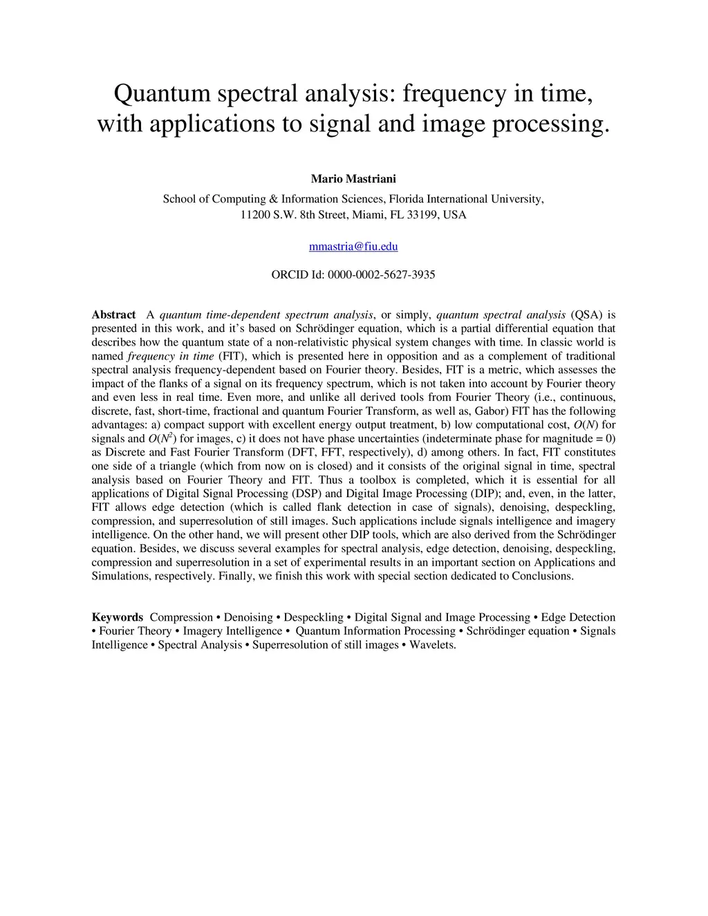 A quantum time-dependent spectrum analysis, or simply, quantum spectral analysis (QSA) is presented in this work, and it is based on Schrodinger equation, which is a partial differential equation that describes how the quantum state of a non-relativistic physical system changes with time. In classic world is named frequency in time (FIT), which is presented here in opposition and as a complement of traditional spectral analysis frequency-dependent based on Fourier theory. Besides, FIT is a metric, which assesses the impact of the flanks of a signal on its frequency spectrum, which is not taken into account by Fourier theory and even less in real time. Even more, and unlike all derived tools from Fourier Theory (i.e., continuous, discrete, fast, short-time, fractional and quantum Fourier Transform, as well as, Gabor) FIT has the following advantages: a) compact support with excellent energy output treatment, b) low computational cost, O(N) for signals and O(N2) for images, c) it does not have phase uncertainties (indeterminate phase for magnitude = 0) as Discrete and Fast Fourier Transform (DFT, FFT, respectively), d) among others. In fact, FIT constitutes one side of a triangle (which from now on is closed) and it consists of the original signal in time, spectral analysis based on Fourier Theory and FIT. Thus a toolbox is completed, which it is essential for all applications of Digital Signal Processing (DSP) and Digital Image Processing (DIP); and, even, in the latter, FIT allows edge detection (which is called flank detection in case of signals), denoising, despeckling, compression, and superresolution of still images. Such applications include signals intelligence and imagery intelligence. On the other hand, we will present other DIP tools, which are also derived from the Schrodinger equation.