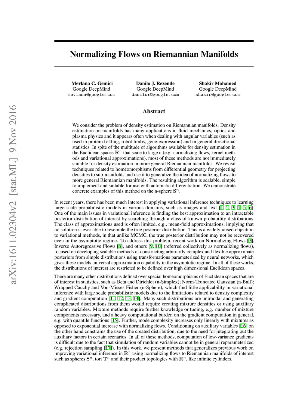 We consider the problem of density estimation on Riemannian manifolds. Density estimation on manifolds has many applications in fluid-mechanics, optics and plasma physics and it appears often when dealing with angular variables (such as used in protein folding, robot limbs, gene-expression) and in general directional statistics. In spite of the multitude of algorithms available for density estimation in the Euclidean spaces that scale to large n (e.g. normalizing flows, kernel methods and variational approximations), most of these methods are not immediately suitable for density estimation in more general Riemannian manifolds. We revisit techniques related to homeomorphisms from differential geometry for projecting densities to sub-manifolds and use it to generalize the idea of normalizing flows to more general Riemannian manifolds. The resulting algorithm is scalable, simple to implement and suitable for use with automatic differentiation. We demonstrate concrete examples of this method on the n-sphere .