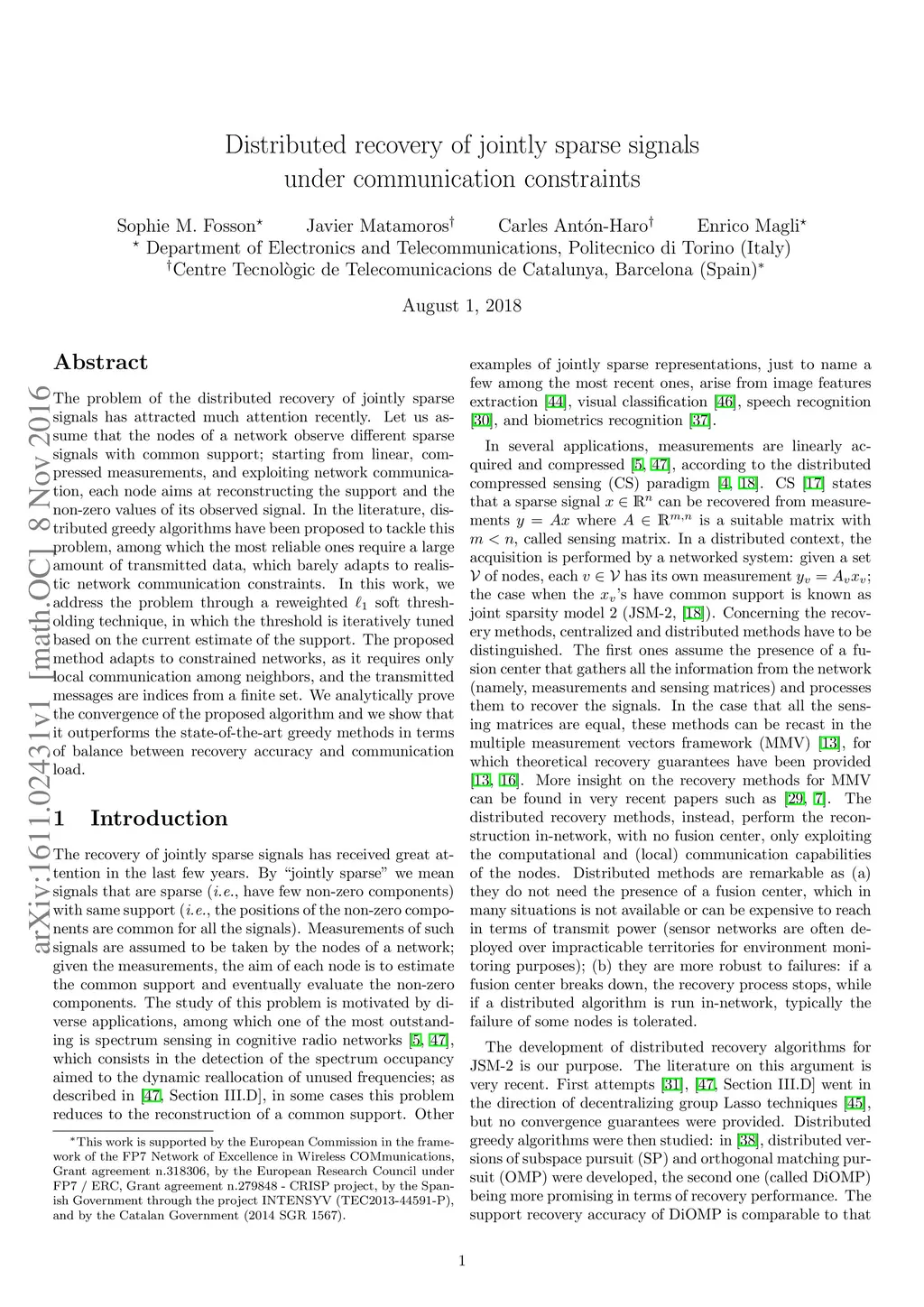 The problem of the distributed recovery of jointly sparse signals has attracted much attention recently. Let us assume that the nodes of a network observe different sparse signals with common support; starting from linear, compressed measurements, and exploiting network communication, each node aims at reconstructing the support and the non-zero values of its observed signal. In the literature, distributed greedy algorithms have been proposed to tackle this problem, among which the most reliable ones require a large amount of transmitted data, which barely adapts to realistic network communication constraints. In this work, we address the problem through a reweighted soft thresholding technique, in which the threshold is iteratively tuned based on the current estimate of the support. The proposed method adapts to constrained networks, as it requires only local communication among neighbors, and the transmitted messages are indices from a finite set. We analytically prove the convergence of the proposed algorithm and we show that it outperforms the state-of-the-art greedy methods in terms of balance between recovery accuracy and communication load.