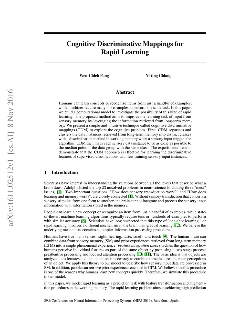 Humans can learn concepts or recognize items from just a handful of examples, while machines require many more samples to perform the same task. In this paper, we build a computational model to investigate the possibility of this kind of rapid learning. The proposed method aims to improve the learning task of input from sensory memory by leveraging the information retrieved from long-term memory. We present a simple and intuitive technique called cognitive discriminative mappings (CDM) to explore the cognitive problem. First, CDM separates and clusters the data instances retrieved from long-term memory into distinct classes with a discrimination method in working memory when a sensory input triggers the algorithm. CDM then maps each sensory data instance to be as close as possible to the median point of the data group with the same class. The experimental results demonstrate that the CDM approach is effective for learning the discriminative features of supervised classifications with few training sensory input instances.
