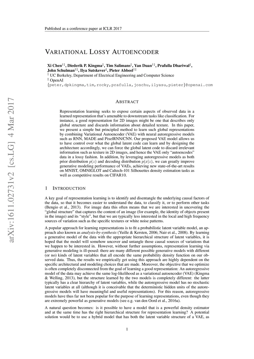 Representation learning seeks to expose certain aspects of observed data in a learned representation that's amenable to downstream tasks like classification. For instance, a good representation for 2D images might be one that describes only global structure and discards information about detailed texture. In this paper, we present a simple but principled method to learn such global representations by combining Variational Autoencoder (VAE) with neural autoregressive models such as RNN, MADE and PixelRNN/CNN. Our proposed VAE model allows us to have control over what the global latent code can learn and , by designing the architecture accordingly, we can force the global latent code to discard irrelevant information such as texture in 2D images, and hence the VAE only "autoencodes" data in a lossy fashion. In addition, by leveraging autoregressive models as both prior distribution and decoding distribution , we can greatly improve generative modeling performance of VAEs, achieving new state-of-the-art results on MNIST, OMNIGLOT and Caltech-101 Silhouettes density estimation tasks.