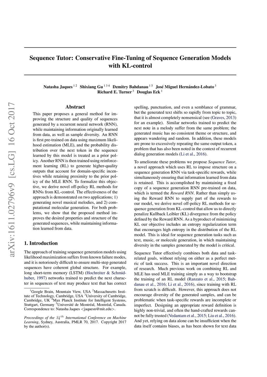 This paper proposes a general method for improving the structure and quality of sequences generated by a recurrent neural network (RNN), while maintaining information originally learned from data, as well as sample diversity. An RNN is first pre-trained on data using maximum likelihood estimation (MLE), and the probability distribution over the next token in the sequence learned by this model is treated as a prior policy. Another RNN is then trained using reinforcement learning (RL) to generate higher-quality outputs that account for domain-specific incentives while retaining proximity to the prior policy of the MLE RNN. To formalize this objective, we derive novel off-policy RL methods for RNNs from KL-control. The effectiveness of the approach is demonstrated on two applications; 1) generating novel musical melodies, and 2) computational molecular generation. For both problems, we show that the proposed method improves the desired properties and structure of the generated sequences, while maintaining information learned from data.