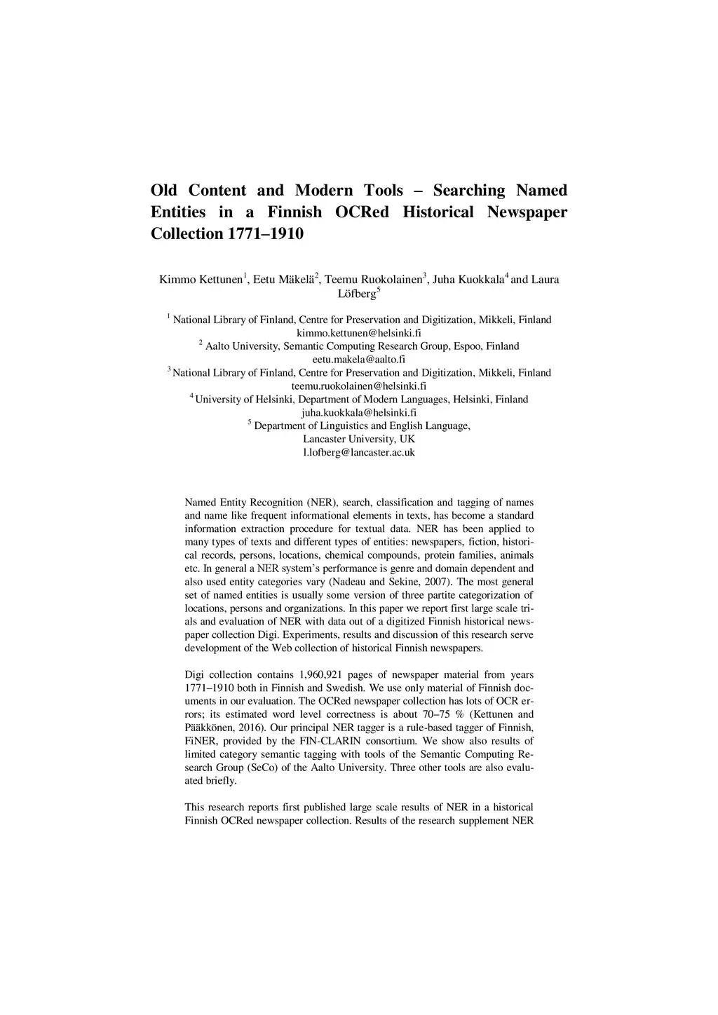 Old Content and Modern Tools - Searching Named Entities in a Finnish
