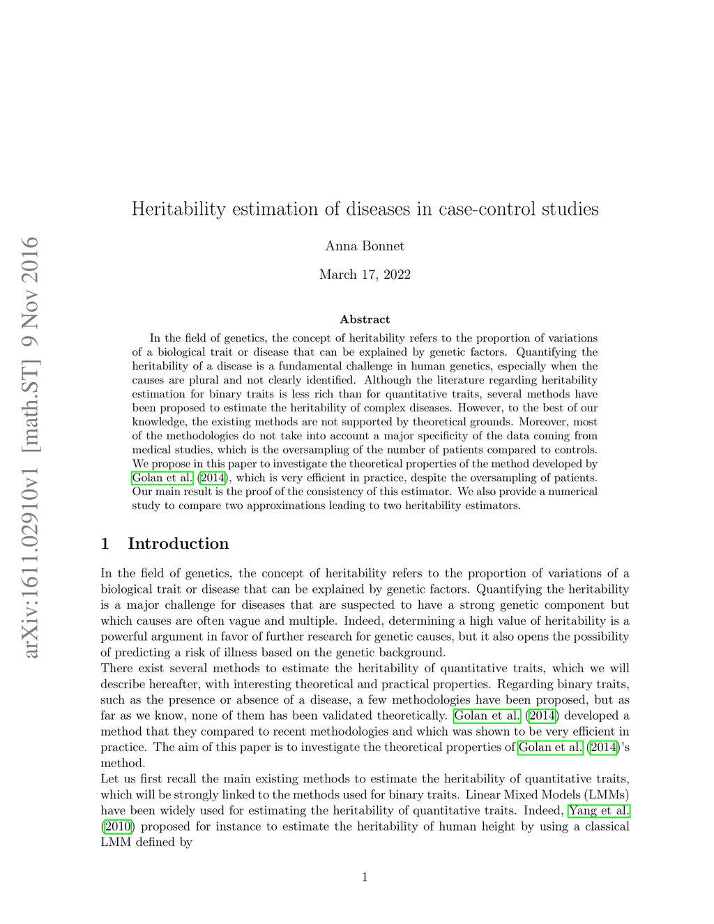 In the field of genetics, the concept of heritability refers to the proportion of variations of a biological trait or disease that can be explained by genetic factors. Quantifying the heritability of a disease is a fundamental challenge in human genetics, especially when the causes are plural and not clearly identified. Although the literature regarding heritability estimation for binary traits is less rich than for quantitative traits, several methods have been proposed to estimate the heritability of complex diseases. However, to the best of our knowledge, the existing methods are not supported by theoretical grounds. Moreover, most of the methodologies do not take into account a major specificity of the data coming from medical studies, which is the oversampling of the number of patients compared to controls. We propose in this paper to investigate the theoretical properties of the method developed by Golan et al. (2014), which is very efficient in practice, despite the oversampling of patients. Our main result is the proof of the consistency of this estimator. We also provide a numerical study to compare two approximations leading to two heritability estimators.