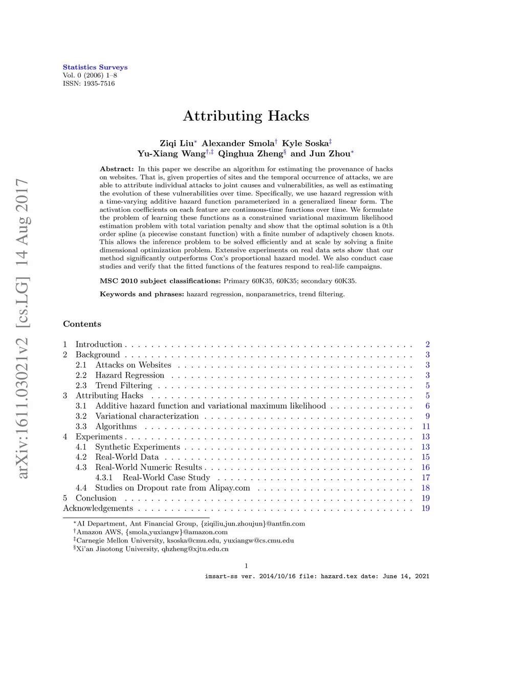 In this paper we describe an algorithm for estimating the provenance of hacks on websites. That is, given properties of sites and the temporal occurrence of attacks, we are able to attribute individual attacks to joint causes and vulnerabilities, as well as estimating the evolution of these vulnerabilities over time. Specifically, we use hazard regression with a time-varying additive hazard function parameterized in a generalized linear form. The activation coefficients on each feature are continuous-time functions over time. We formulate the problem of learning these functions as a constrained variational maximum likelihood estimation problem with total variation penalty and show that the optimal solution is a 0th order spline (a piecewise constant function) with a finite number of known knots. This allows the inference problem to be solved efficiently and at scale by solving a finite dimensional optimization problem. Extensive experiments on real data sets show that our method significantly outperforms Cox's proportional hazard model. We also conduct a case study and verify that the fitted functions are indeed recovering vulnerable features and real-life events such as the release of code to exploit these features in hacker blogs.