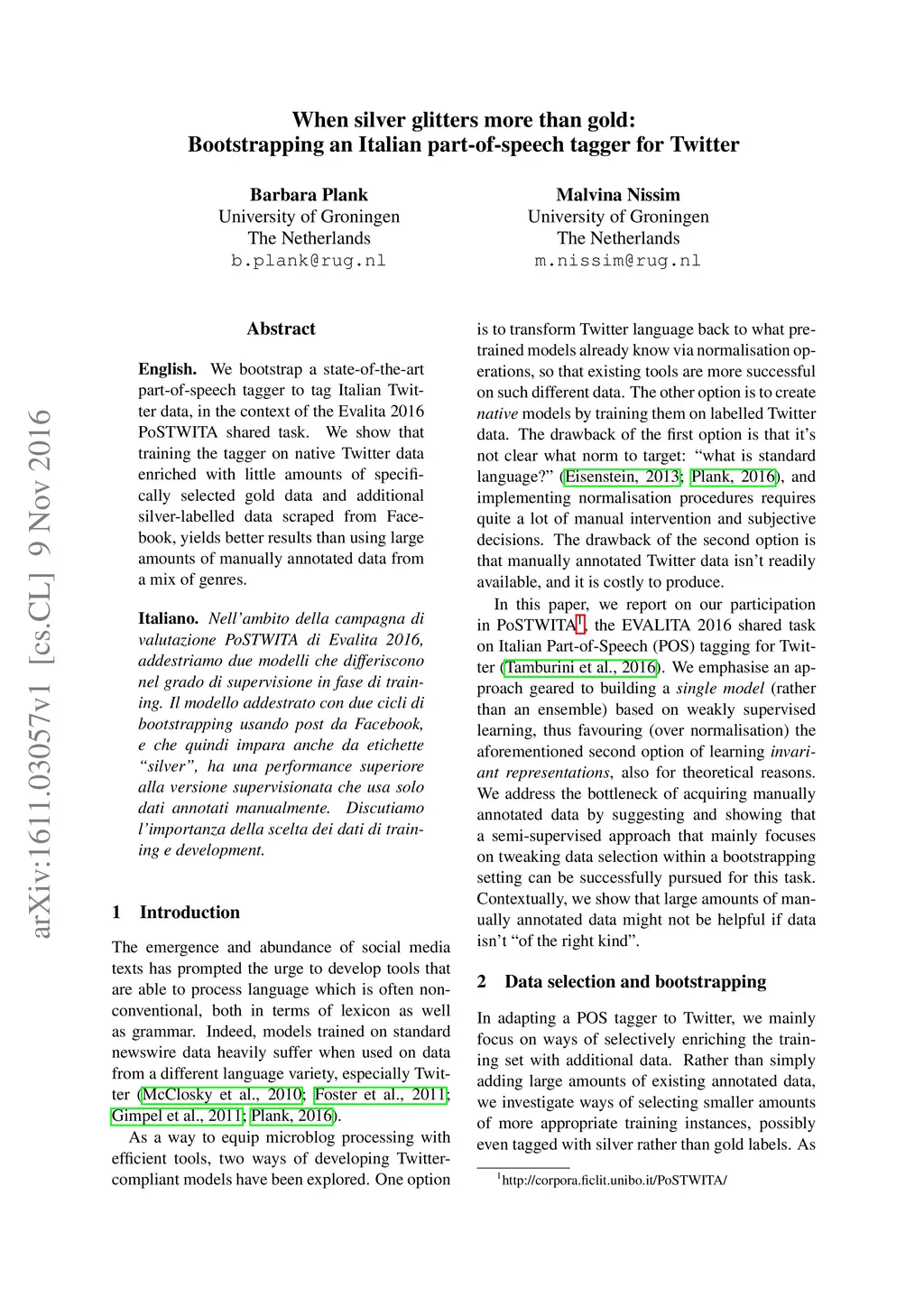 We bootstrap a state-of-the-art part-of-speech tagger to tag Italian Twitter data, in the context of the Evalita 2016 PoSTWITA shared task. We show that training the tagger on native Twitter data enriched with little amounts of specifically selected gold data and additional silver-labelled data scraped from Facebook, yields better results than using large amounts of manually annotated data from a mix of genres.