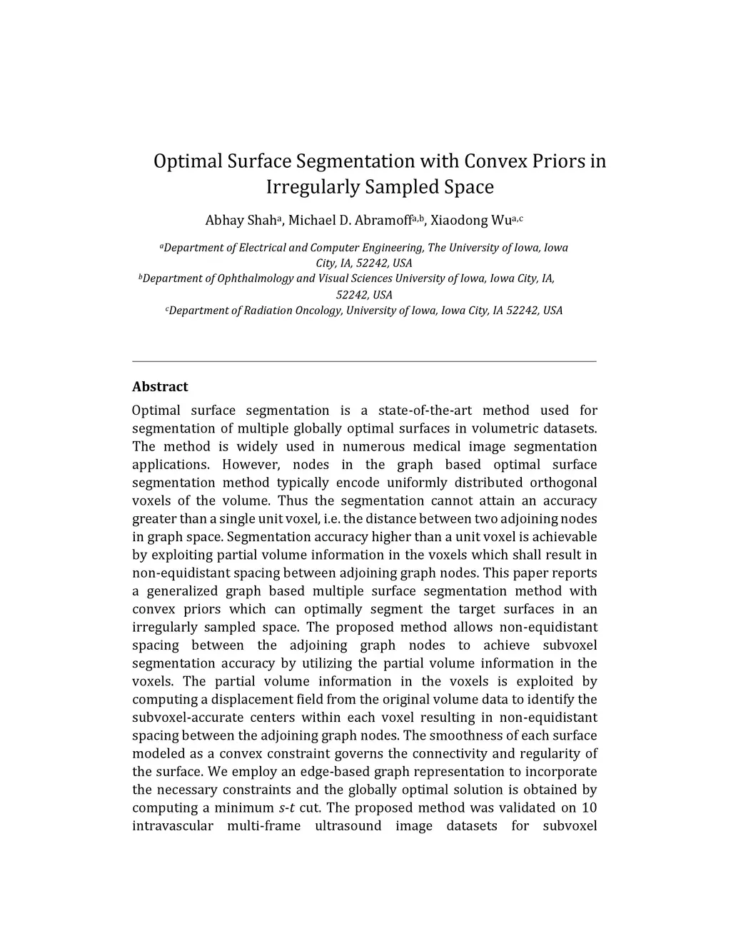 Optimal surface segmentation is a state-of-the-art method used for segmentation of multiple globally optimal surfaces in volumetric datasets. The method is widely used in numerous medical image segmentation applications. However, nodes in the graph based optimal surface segmentation method typically encode uniformly distributed orthogonal voxels of the volume. Thus the segmentation cannot attain an accuracy greater than a single unit voxel, i.e. the distance between two adjoining nodes in graph space. Segmentation accuracy higher than a unit voxel is achievable by exploiting partial volume information in the voxels which shall result in non-equidistant spacing between adjoining graph nodes. This paper reports a generalized graph based multiple surface segmentation method with convex priors which can optimally segment the target surfaces in an irregularly sampled space. The proposed method allows non-equidistant spacing between the adjoining graph nodes to achieve subvoxel segmentation accuracy by utilizing the partial volume information in the voxels. The partial volume information in the voxels is exploited by computing a displacement field from the original volume data to identify the subvoxel-accurate centers within each voxel resulting in non-equidistant spacing between the adjoining graph nodes. The smoothness of each surface modeled as a convex constraint governs the connectivity and regularity of the surface. We employ an edge-based graph representation to incorporate the necessary constraints and the globally optimal solution is obtained by computing a minimum s-t cut. The proposed method was validated on 10 intravascular multi-frame ultrasound image datasets for subvoxel segmentation accuracy. In all cases, the approach yielded highly accurate results. Our approach can be readily extended to higher-dimensional segmentations.