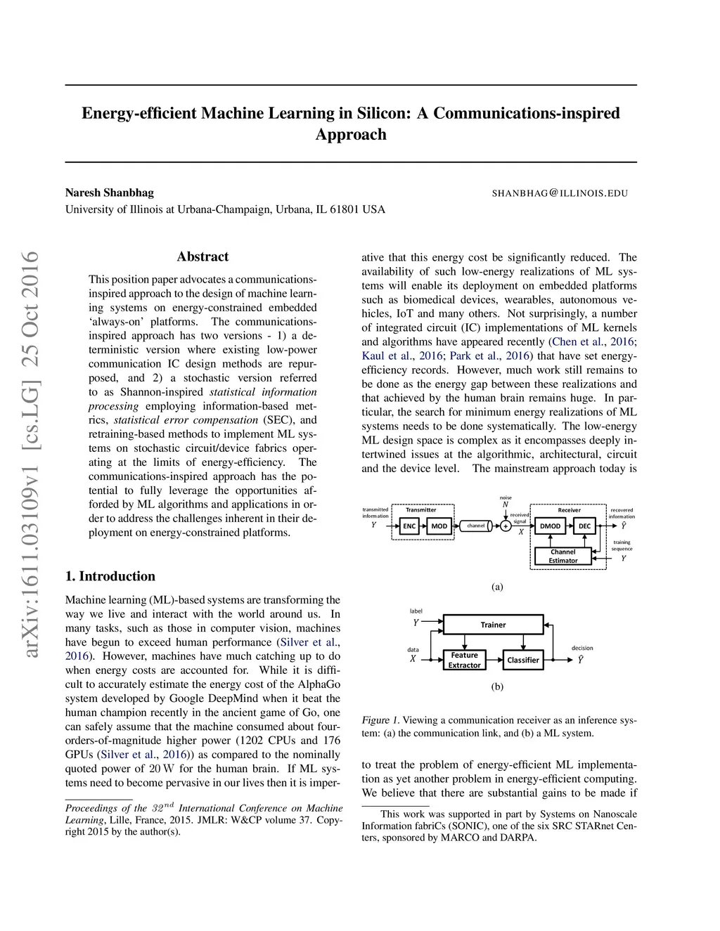 This position paper advocates a communications-inspired approach to the design of machine learning systems on energy-constrained embedded `always-on' platforms. The communications-inspired approach has two versions - 1) a deterministic version where existing low-power communication IC design methods are repurposed, and 2) a stochastic version referred to as Shannon-inspired statistical information processing employing information-based metrics, statistical error compensation (SEC), and retraining-based methods to implement ML systems on stochastic circuit/device fabrics operating at the limits of energy-efficiency. The communications-inspired approach has the potential to fully leverage the opportunities afforded by ML algorithms and applications in order to address the challenges inherent in their deployment on energy-constrained platforms.