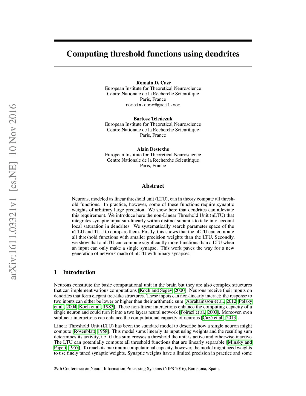 Neurons, modeled as linear threshold unit (LTU), can in theory compute all thresh- old functions. In practice, however, some of these functions require synaptic weights of arbitrary large precision. We show here that dendrites can alleviate this requirement. We introduce here the non-Linear Threshold Unit (nLTU) that integrates synaptic input sub-linearly within distinct subunits to take into account local saturation in dendrites. We systematically search parameter space of the nTLU and TLU to compare them. Firstly, this shows that the nLTU can compute all threshold functions with smaller precision weights than the LTU. Secondly, we show that a nLTU can compute significantly more functions than a LTU when an input can only make a single synapse. This work paves the way for a new generation of network made of nLTU with binary synapses.