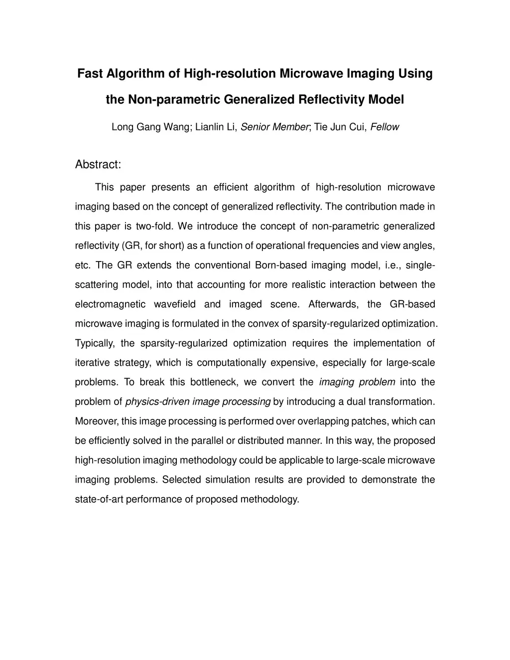 This paper presents an efficient algorithm of high-resolution microwave imaging based on the concept of generalized reflectivity. The contribution made in this paper is two-fold. We introduce the concept of non-parametric generalized reflectivity (GR, for short) as a function of operational frequencies and view angles, etc. The GR extends the conventional Born-based imaging model, i.e., single-scattering model, into that accounting for more realistic interaction between the electromagnetic wavefield and imaged scene. Afterwards, the GR-based microwave imaging is formulated in the convex of sparsity-regularized optimization. Typically, the sparsity-regularized optimization requires the implementation of iterative strategy, which is computationally expensive, especially for large-scale problems. To break this bottleneck, we convert the imaging problem into the problem of physics-driven image processing by introducing a dual transformation. Moreover, this image processing is performed over overlapping patches, which can be efficiently solved in the parallel or distributed manner. In this way, the proposed high-resolution imaging methodology could be applicable to large-scale microwave imaging problems. Selected simulation results are provided to demonstrate the state-of-art performance of proposed methodology.
